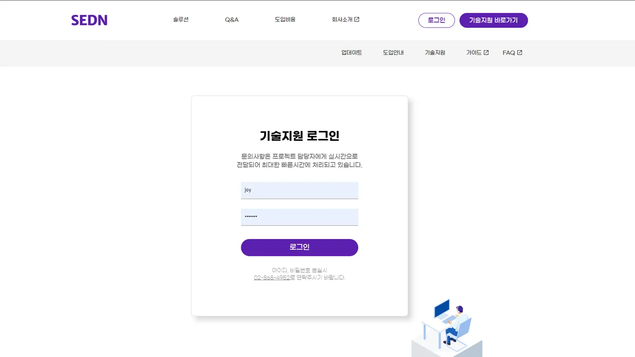 ● SEDN 도입고객사이라면 기술지원 로그인 아이디를 부여받게되며 해당 계정으로 로그인 하실수 있습니다. 계정정보 입력 → [로그인]