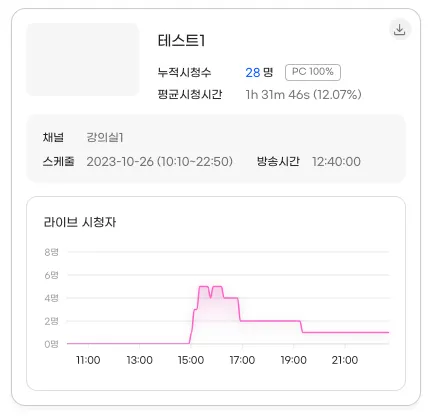 각 스케줄별 우측 상단에 다운로드 버튼이 있으며 해당 스케줄의 시간대별 동시접속시청자수 (con-current user, 8분 인터벌) 엑셀파일로 받아볼수 있습니다.