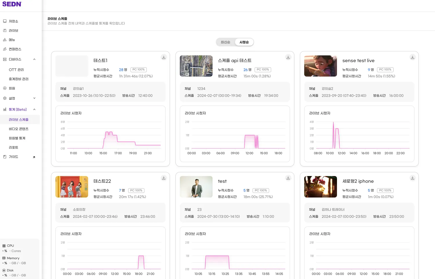 통계 / 라이브스케줄 선택하면 최신등록된 스케줄순 or 시청숫자순으로 내림차순 정렬해서 보여줍니다