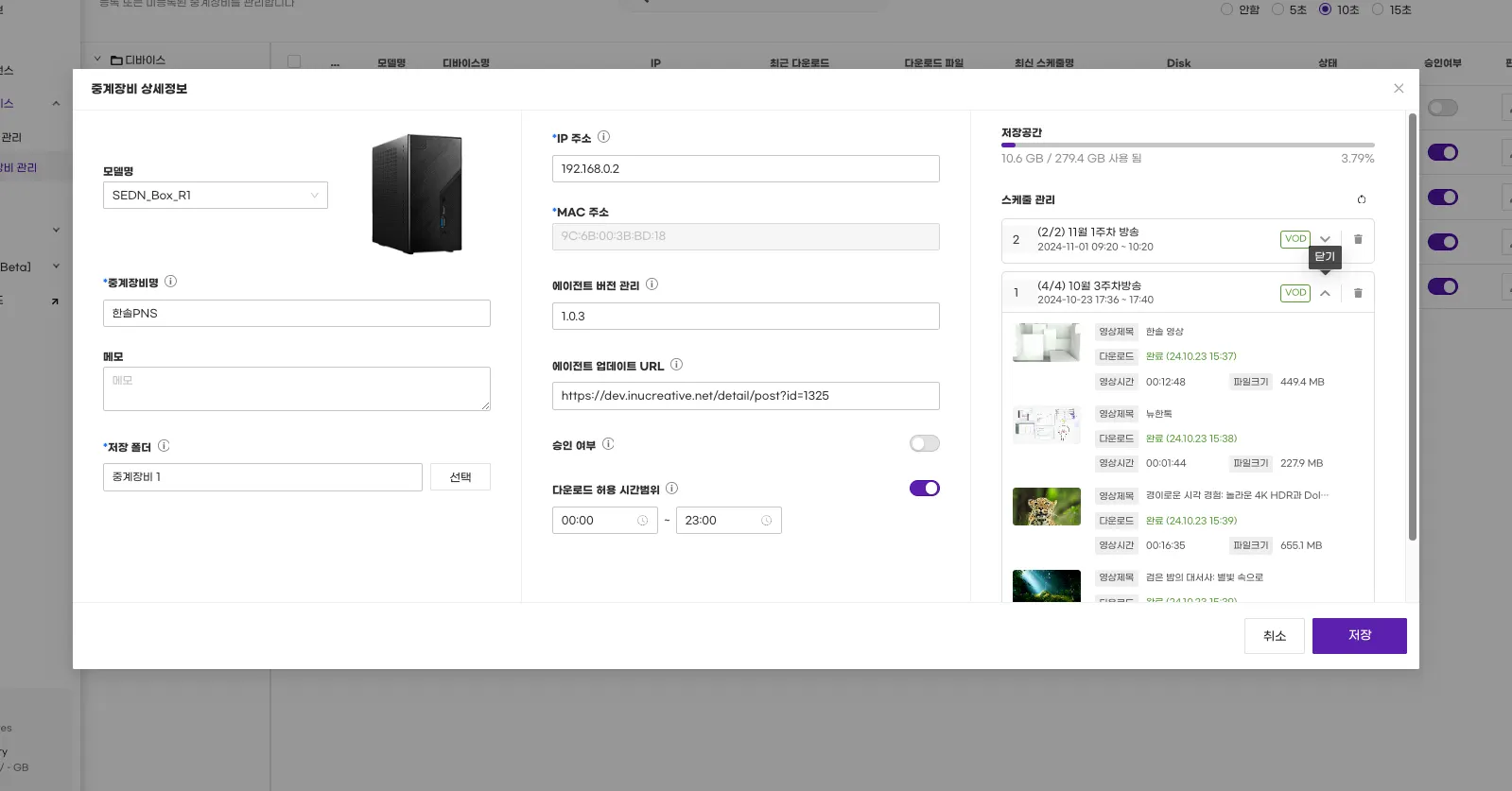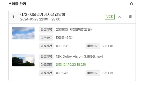 스케줄관리에서는 영상별 다운로드 진행률도 확인할수 있습니다.
