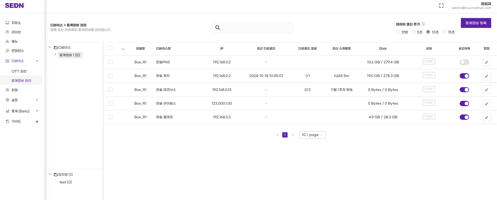 SEDN 디바이스 메뉴에서는 두개의 Device 를 관리할수 있으며 TV에 바로 연결하여 리모컨으로 제어하는 OTT 장비(IP-STB)와 트래픽을 분산시키기 위한 재전송하는 역할을 하는 중계장비(Barebone PC) 두가지입니다.