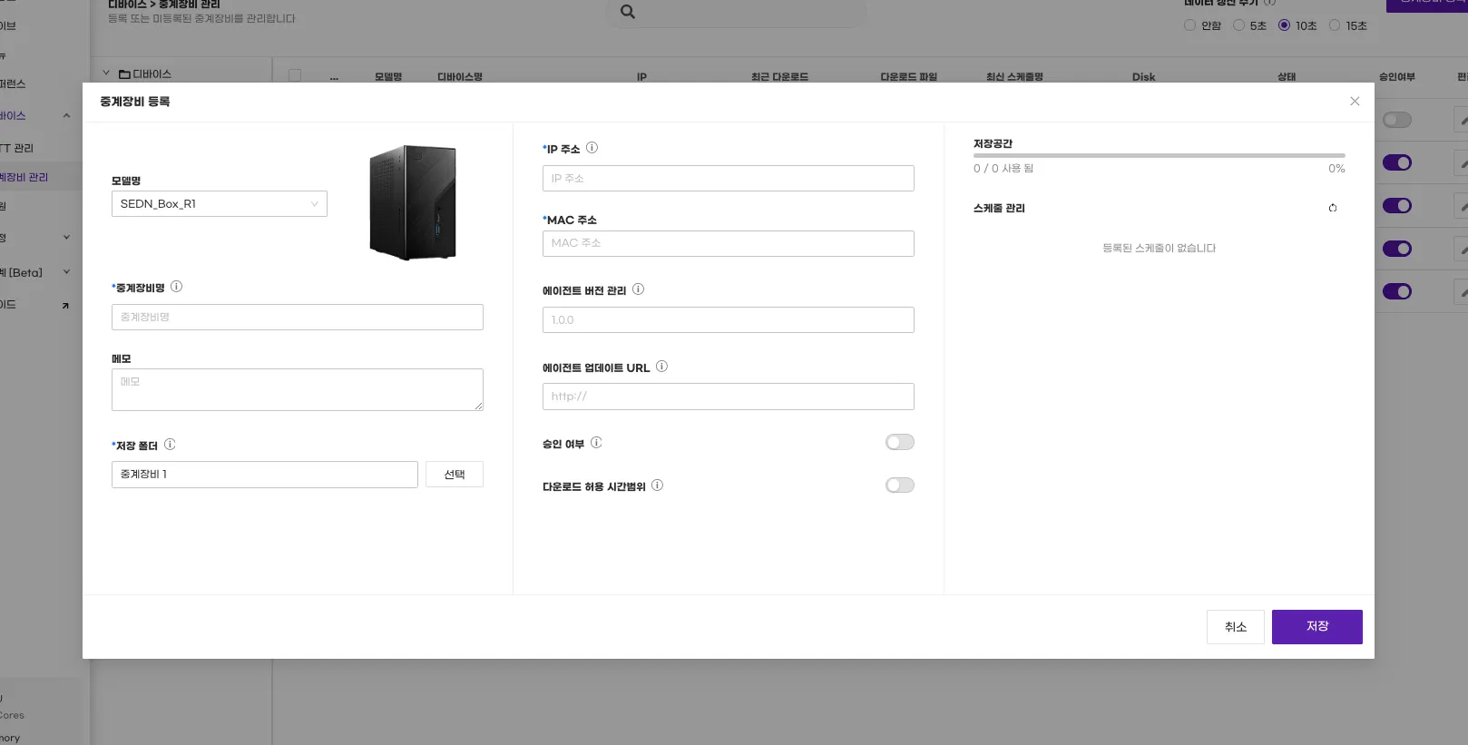 디바이스/중계장비관리 메뉴에 들어가면 등록된 중계장비리스트가 우측에 보입니다