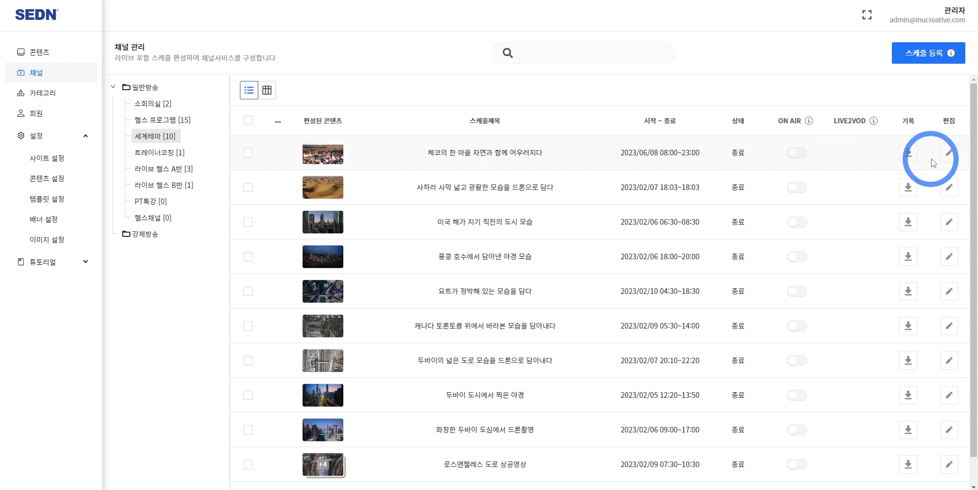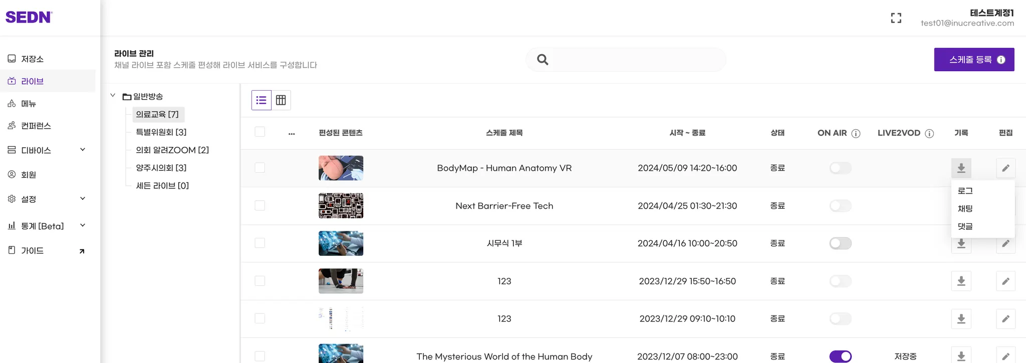 라이브 메뉴의 스케줄 정보 입력 창에서 영상 우측영역 > 채팅으로 선택후 저장하면 해당 스케줄에서 실시간 채팅을 사용할 수 있습니다. 채팅 로그를 원하는 경우 라이브/스케줄 리스트에서 기록 > 채팅 항목을 클릭하면 채팅 로그기록을 엑셀 파일로 다운로드 받을 수도 있습니다.