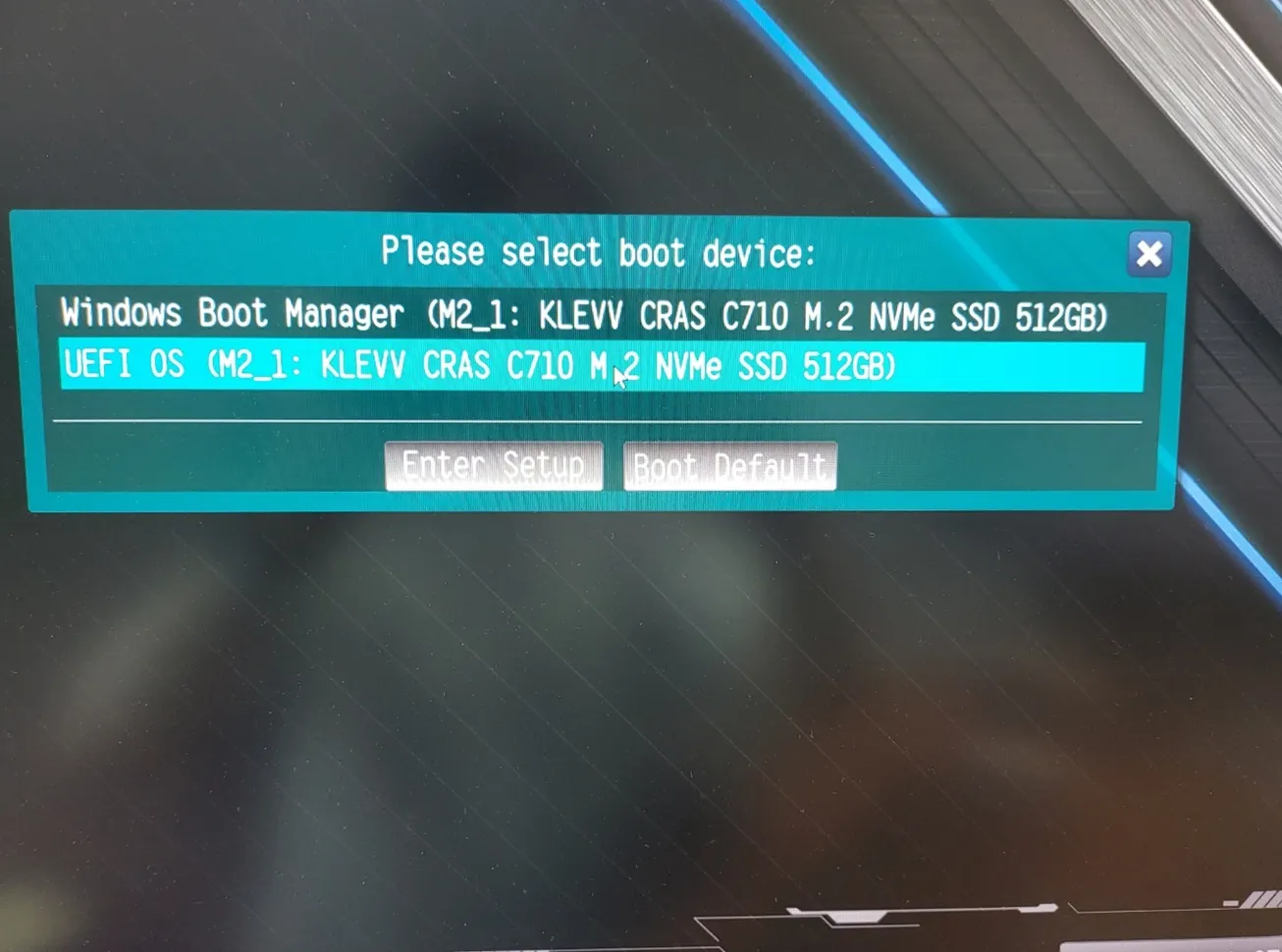 “UEFI OS (M2_1: KLEVV …”, ”CentOS Linux (M2_1: KLEVV…” 선택 후 재부팅