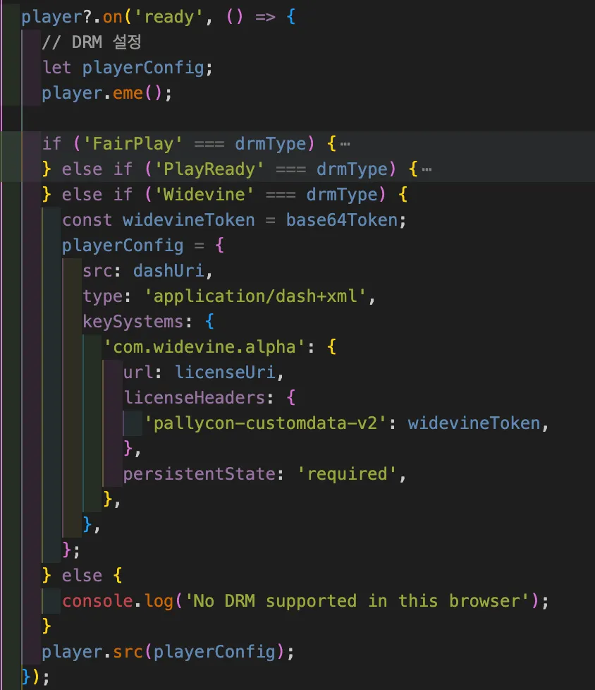 VideoJs가 초기화되는 곳에서 발급받은 토큰으로 DRM 연동 설정을 추가 한다.