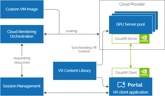 CloudXR Client 간의 통신에 클라우드에서 렌더링 리소스 할당을 처리하고 원하는 VR 콘텐츠를 원격 시스템에 동기화하고 사용자가 원하는 VR 콘텐츠를 선택하면 CloudXR을 실행하는 구조라고 합니다.