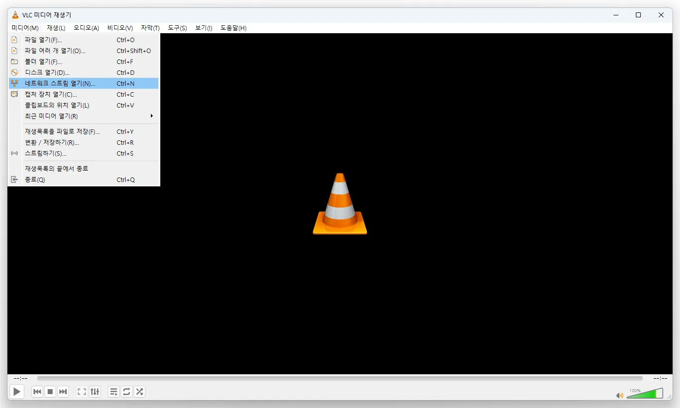 VLC 미디어 재생기에서 [미디어]-[네트워크 스트림 열기]를 클릭해주세요.
