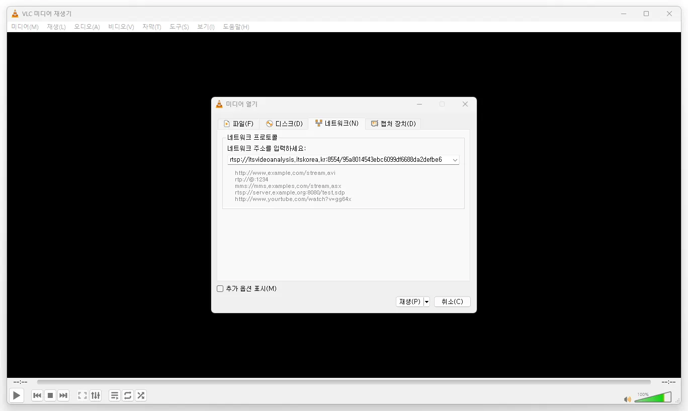 네트워크 주소 입력 영역에 복사한 [RTSP URL]을 붙여넣기 후 [재생] 버튼을 클릭해주세요.