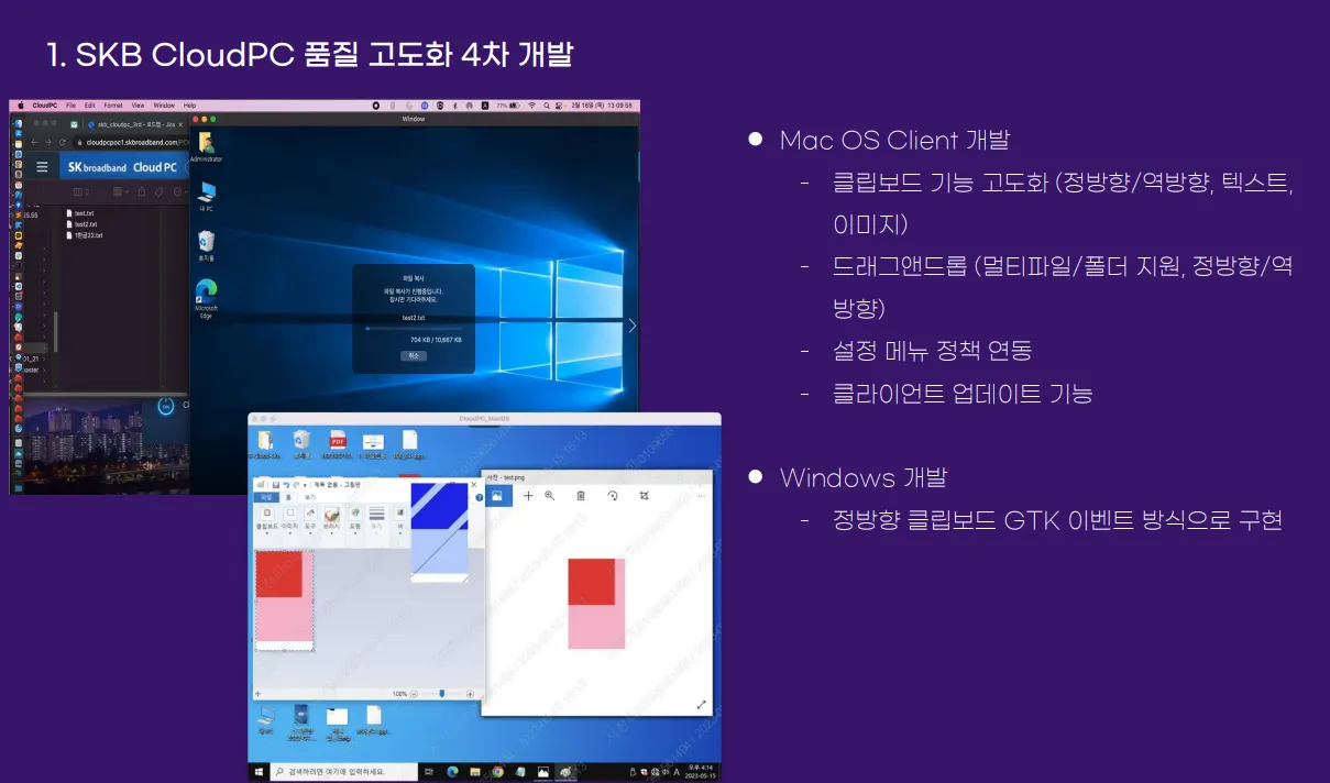 난이도가 높고 코어개발이 가득 한 SKB 품질 고도화 와 ios유지보수 를 맡아서 무려 4차까지 이끌어 왔다네요. Mac OS Client 고도화, F5 Squid Proxy Server 연동 구현 등 어려운 단어들이 난무했지만 이해가 쉽도록 설명도 해주셨어요. 바쁘신 와중에도 스마트카트 와 골프 앱 개발 외주업무도 완료하였다고 합니다. 짝짝