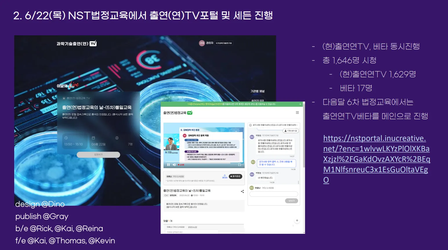 2021~22년에 이어 NST 추가 개발을 통하여 기존 단일페이지에서 전 기관이 이용하였다면, 앞으로는 멀티시스템 미디어포털로 수의 하위기관이 독립적으로 사이트를 운영하면서 채널별 스케줄 또는 최신 비디오 콘텐츠 등을 한 곳에 모아 보여주는 개발 완료하였습니다. 포털 사이트를 직접 관리하지 않아도 주기적으로 각 하위기관의 데이터가 포털 사이트에 업데이트되어 편리하게 이용 가능하여 사용자 분들께 많은 칭찬을 받았습니다.
