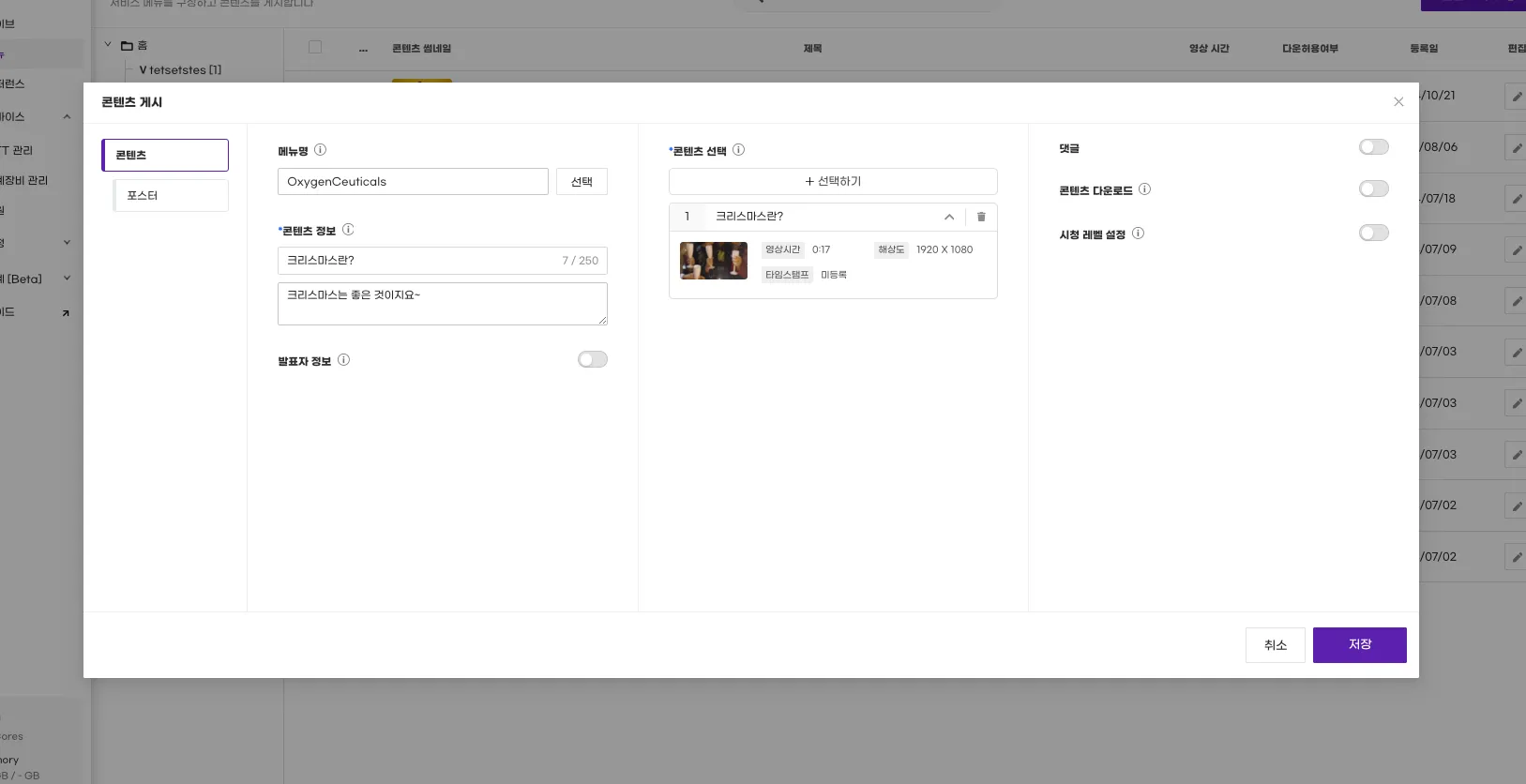 콘텐츠 선택 : 해당폴더에 게시할 콘텐츠를 선택함. 서버에 등록된 콘텐츠를 사전에 선택한 메뉴의 타입에 따라 비디오 또는 포스트 콘텐츠를 게시할 수 있습니다.