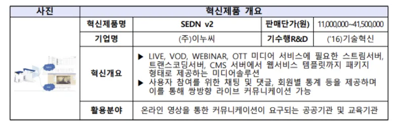 혁신제품이란? 공공서비스의 향상과 기술혁신을 위하여 공공성, 혁신성등 심의를 거쳐 지정되며 SEDN v2 는 우수연구개발제품(Fast Track)통해 2022.12 최종선정되었습니다.