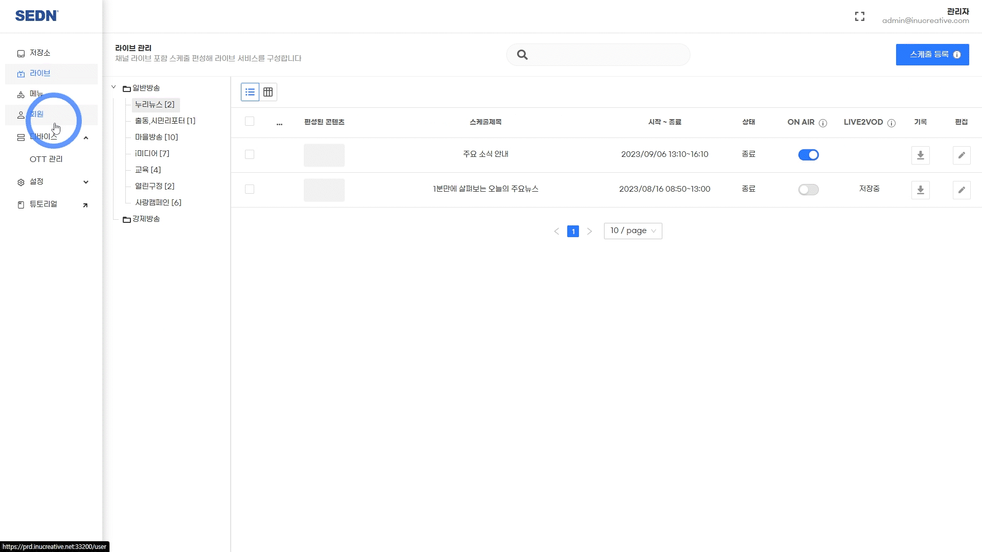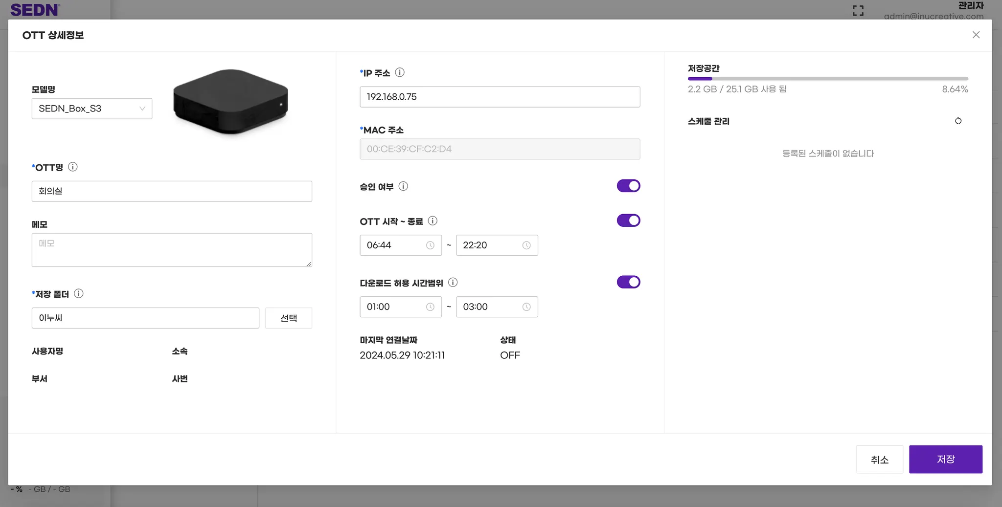 디바이스 메뉴 → OTT 관리에서 우측 상단의 OTT 등록 버튼을 클릭하면 OTT 등록 창이 나타납니다. 새로운 OTT 이름을 입력하고 해당 OTT를 등록할 폴더를 지정해줍니다. IP주소와 MAC주소를 직접 입력하고 승인 여부를 활성화한 후 저장해주면 OTT 직접 등록이 완료됩니다.
