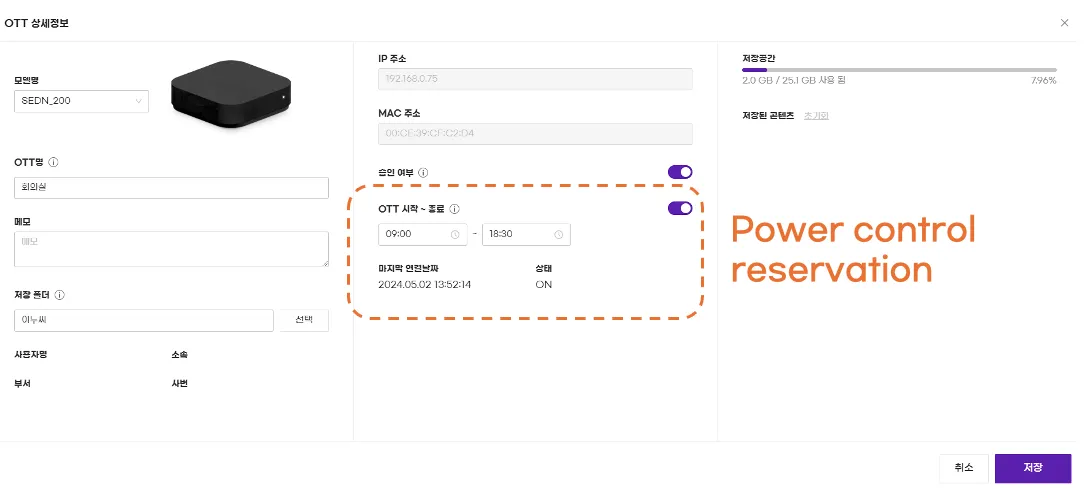 디바이스 활성상태 설정 : 디바이스 자체 전원의 시작(ON)~종료(OFF) 시간을 설정할수 있어 스케줄링 편성과 상관없이 하드웨어 독립적으로 정해진 시간에 끄고 켤수 있음.