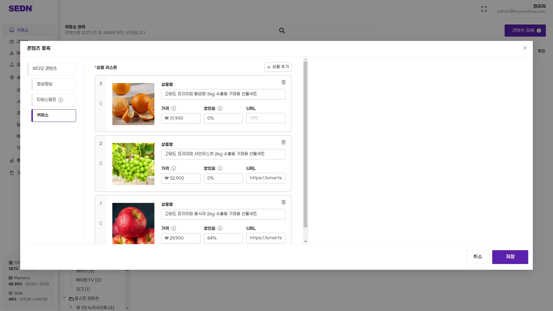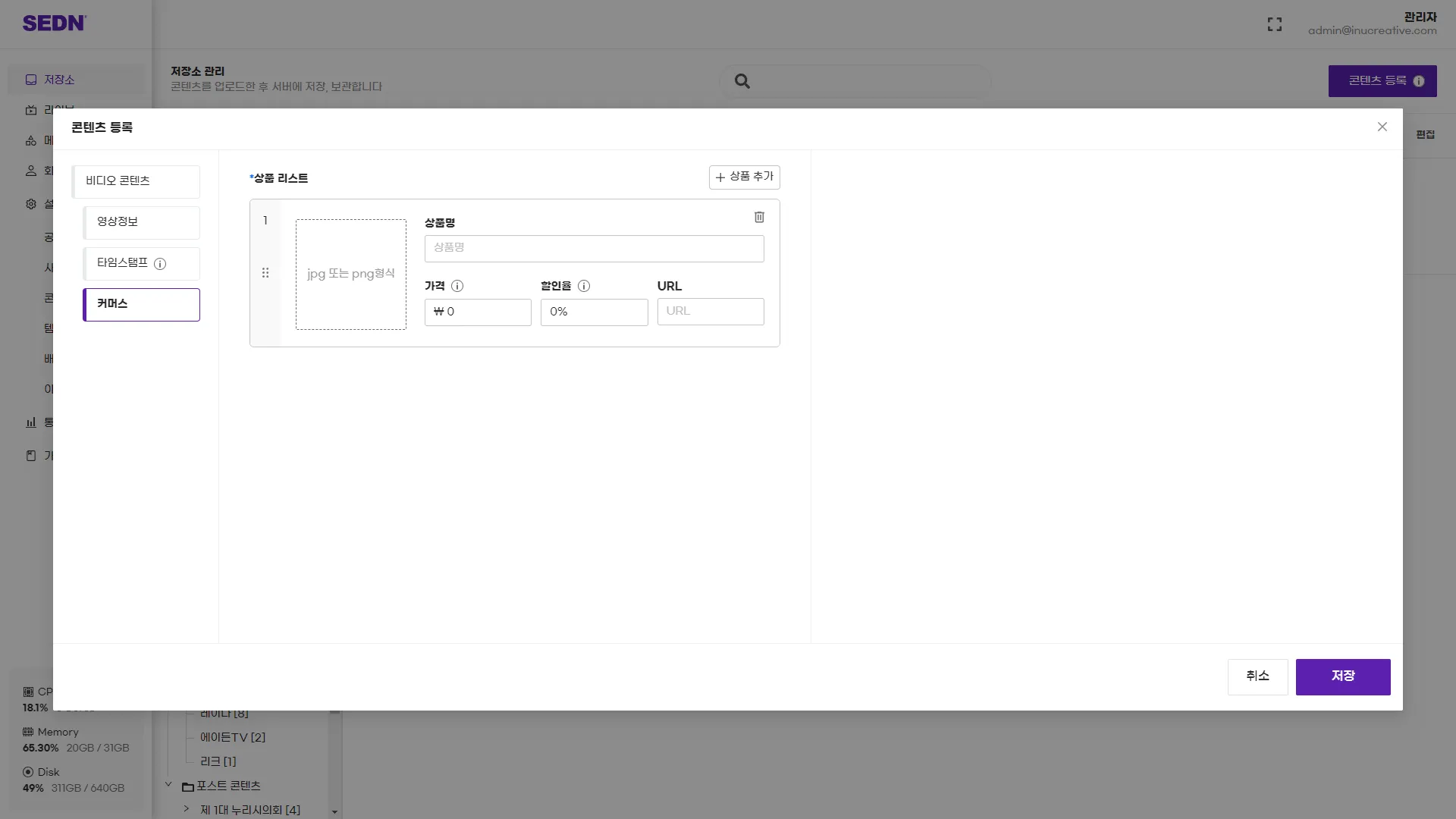 커머스에디션 관리자의 경우 비디오 or 라이브콘텐츠 타입에서 상품정보를 다수 입력할수 있는 [커머스] tap 제공됩니다