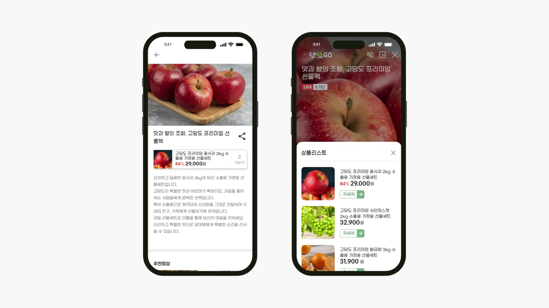 커머스 에디션에서 라이브 커머스(실시간 방송)와 비디오 콘텐츠에서 사용 가능한 커머스 기능 예시