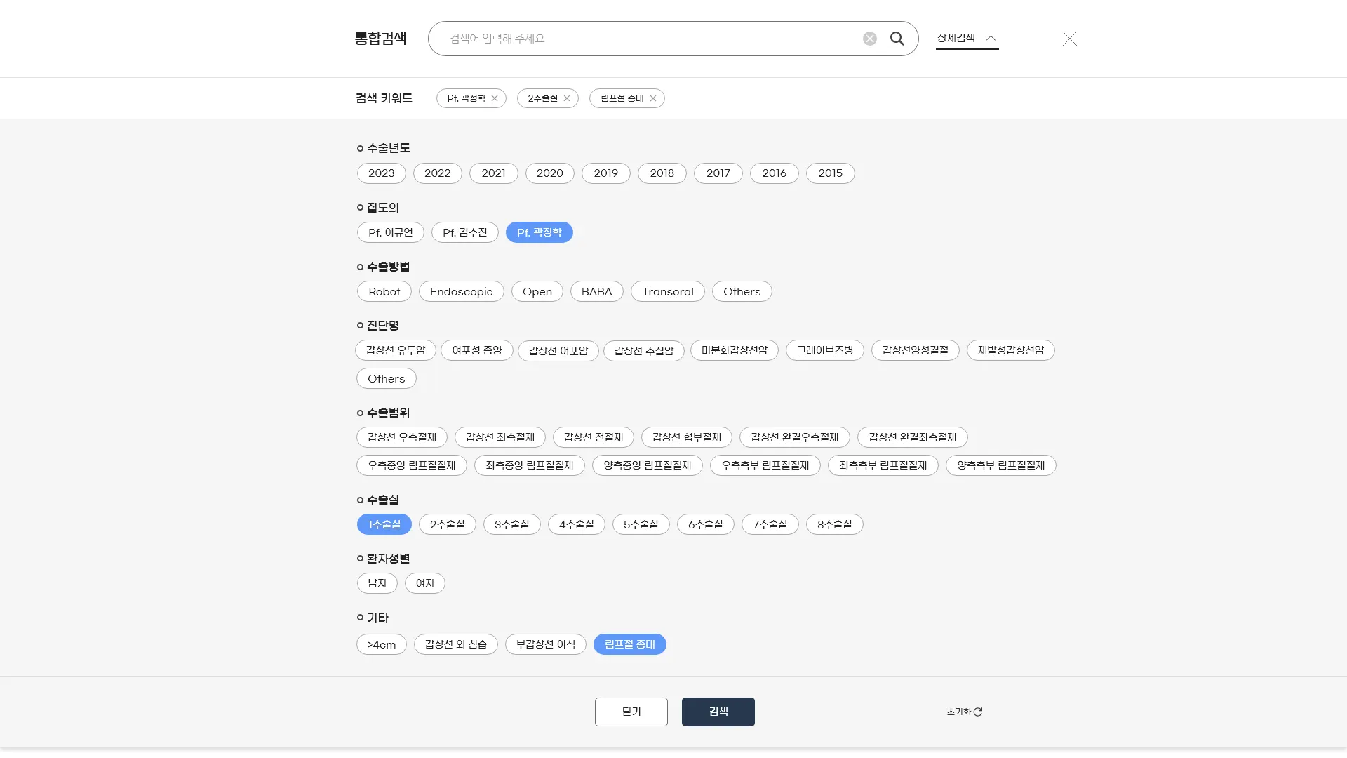 수술 상세 정보에 입력한 데이터를 기반으로 통합검색에서 필터 기능을 사용할 수 있습니다. 원하는 컨텐츠를 보다 빠르게 탐색할 수 있도록 도와줍니다.