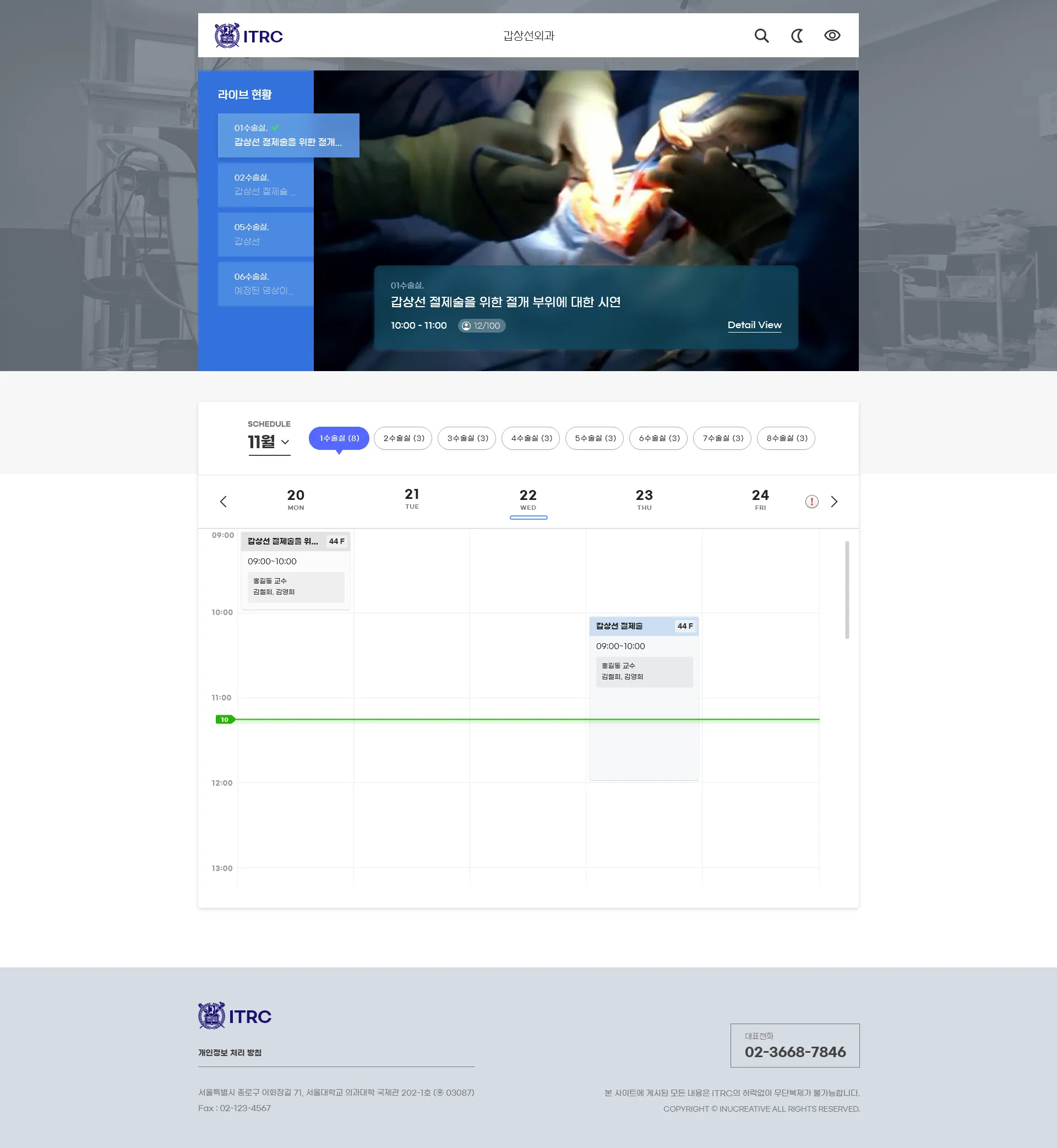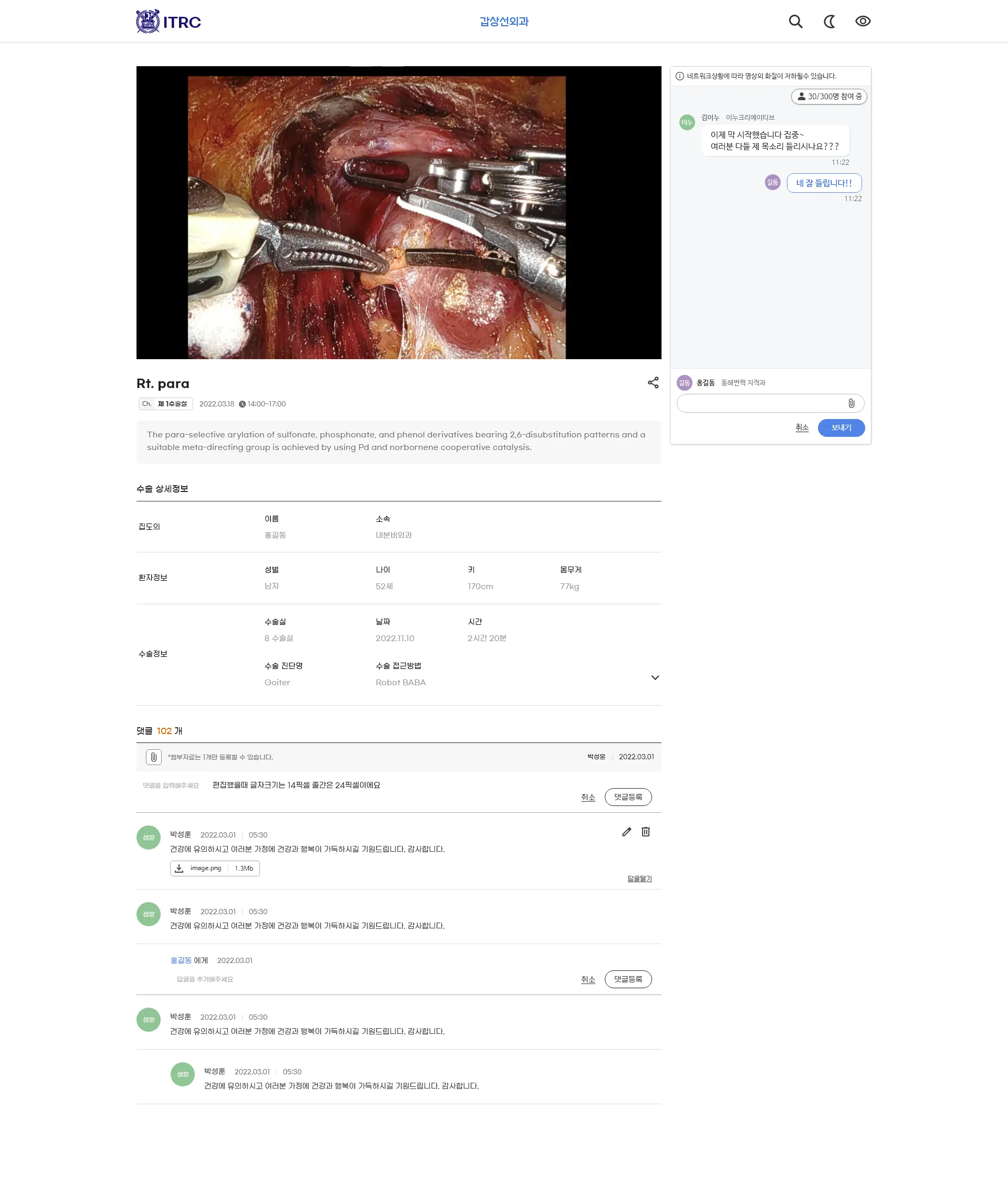라이브 컨텐츠 시청 페이지에서는 송출 중인 화면과 실시간채팅 ,댓글, 첨부파일, 링크 공유, 파일 다운로드, 설문조사 기능을 배치할 수 있으며 비디오 또는 라이브 컨텐츠를 업로드할 때 함께 등록한 수술 상세 정보를 시청자가 확인할 수 있습니다.