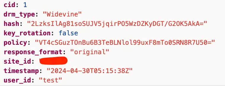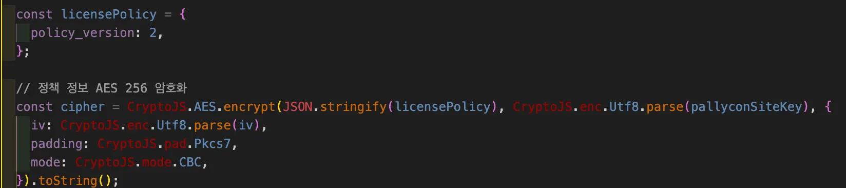 policy : 라이선스 정책 데이터 를 AES 256 방식으로 암호화한 값(위 사진에는 base64 로 인코딩 하라고 나오지만 인코딩 하지 않은 값을 넣어야 에러가 나지 않음 - 설명이 잘못 된 듯 함)
