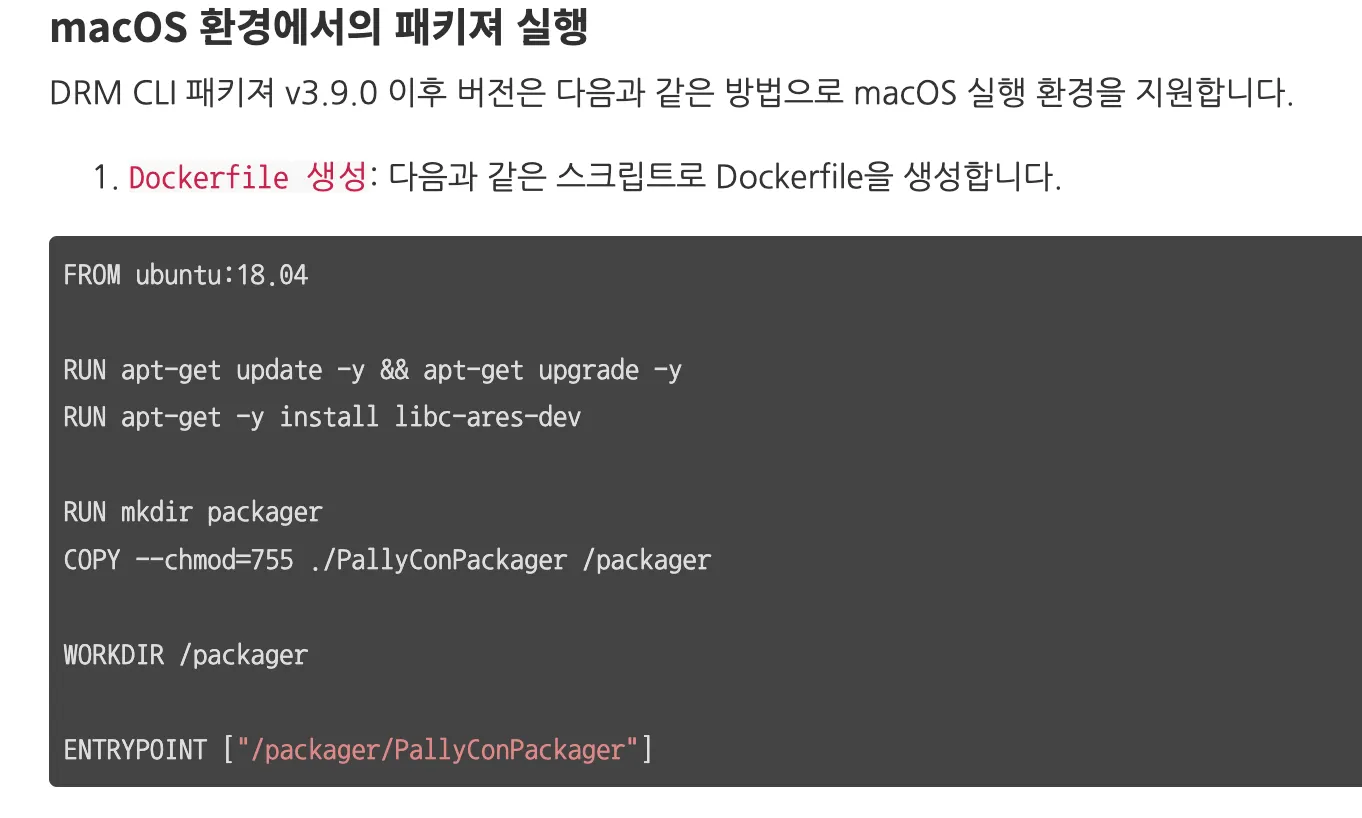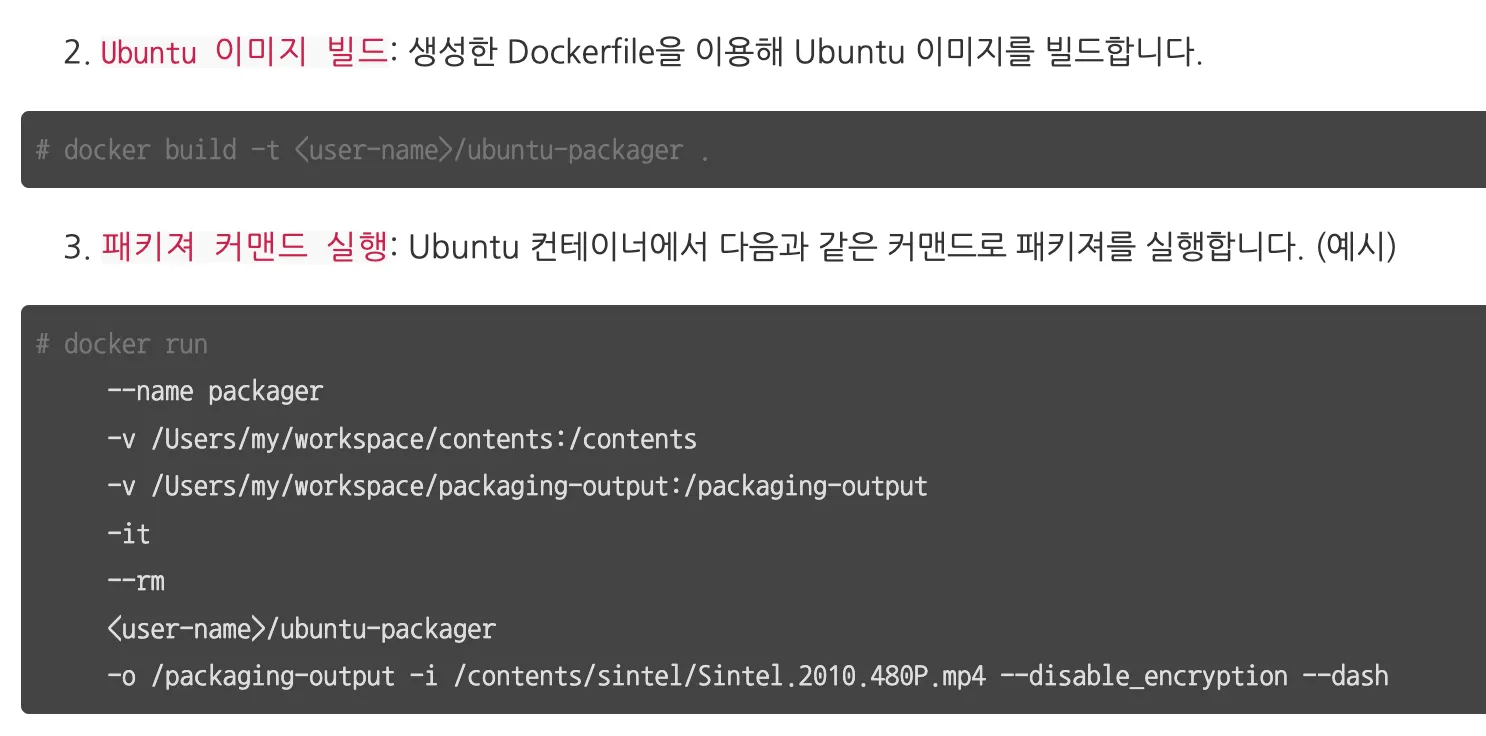 docker run --name packager -v /Users/<유저네임>/Desktop/work/contents:/contents -v /Users/<유저네임>/Desktop/work/packaging-output:/packaging-output -it --rm <유저네임>/ubuntu-packager -o /packaging-output -i /contents/drmtest.mp4 --enc_token (PallyCon KMS와의 CPIX API 통신에 사용되는 KMS 토큰 값. PallyCon 콘솔의 멀티 DRM > DRM 세팅 화면에서 확인 가능) --content_id (고객사 CMS에서 관리하는 ID 값을 입력하며, 이후 클라이언트 연동 단계에서 동일한 CID를 사용해야 함) --hls