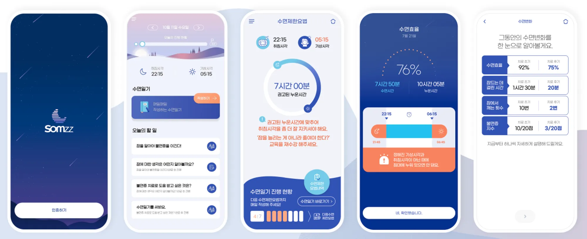 디지털 치료기기(DTx)인 ‘솜즈(Somzz)’는 서울대병원, 삼성서울병원, 고대안암병원의 협력으로 에임메드에서 개발됐으며, 지난해 2월 국내 최초로 식약처 승인을 받은 디지털 치료기기이다. 지난 2022년 시행된 임상시험에서는 불면증 심각도를 효과적으로 낮추고 수면효율을 높이며 안전한 치료임이 확인됐다.
