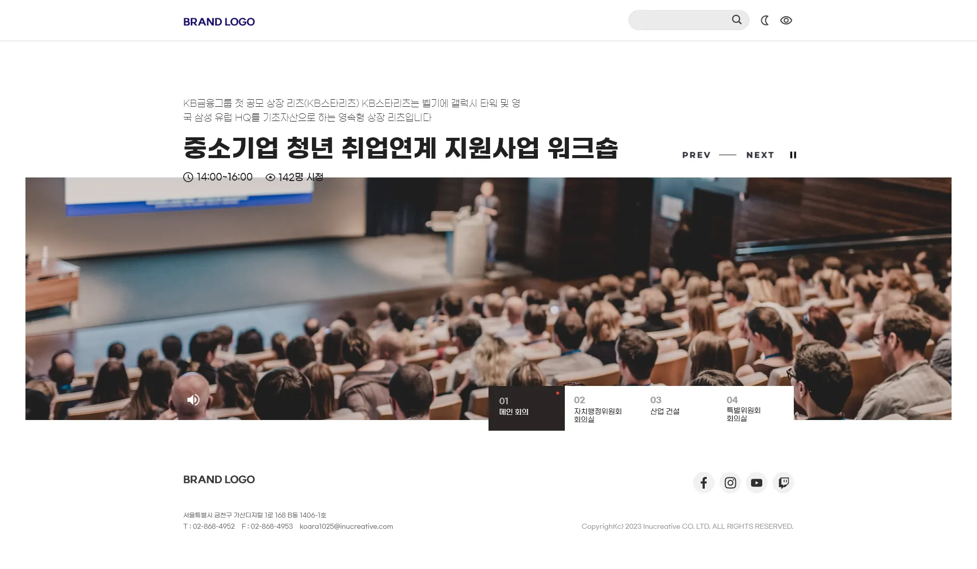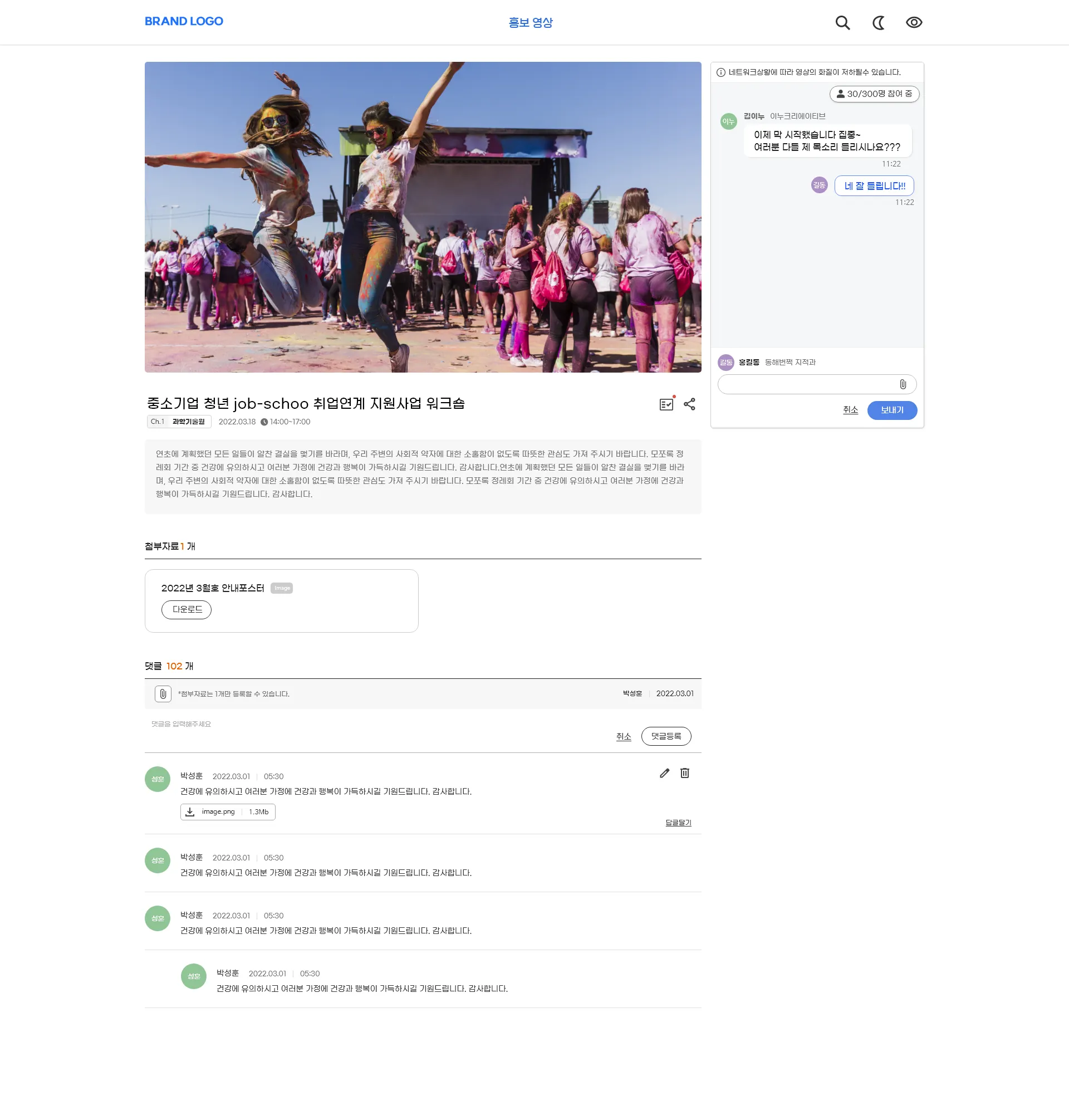 라이브 콘텐츠 시청 페이지에서는 송출 중인 화면과 실시간채팅 ,댓글, 첨부파일, 링크 공유, 파일 다운로드, 설문조사 기능을 배치할 수 있으며 모든 사용자 기능은 관리자 도구에서 ON/OFF 제어할 수 있습니다. 실시간 채팅의 경우 공간이 비어있는 게 싫을 경우 배너 이미지를 업로드, 배치할 수 도 있습니다.