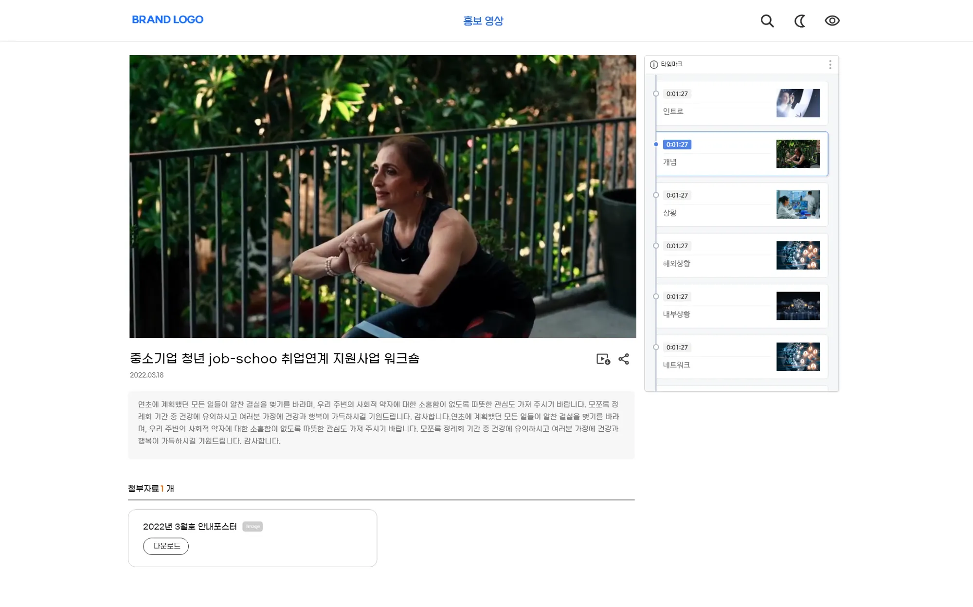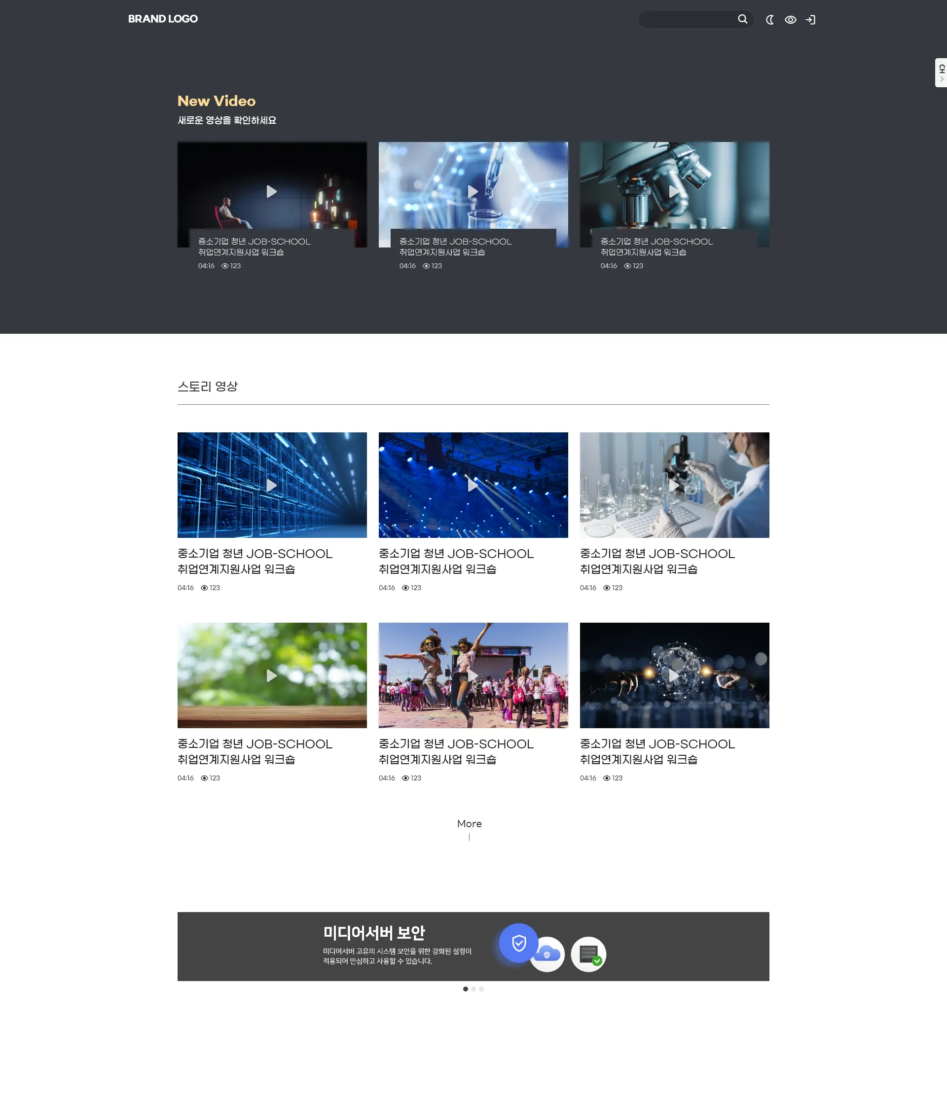 서브페이지는 비디오 콘텐츠 또는 포스트 콘텐츠를 관리자가 메뉴별로 분류한 페이지입니다. 메뉴 구조는 관리자 페이지에서 자유롭게 편집가능합니다. 콘텐츠 상세 페이지로 진입 전 미리보기를 통해 페이지 이동 없이 콘텐츠를 미리 볼 수 있습니다. 서브페이지 하단에는 관리자 페이지에서 등록한 배너가 보여집니다.