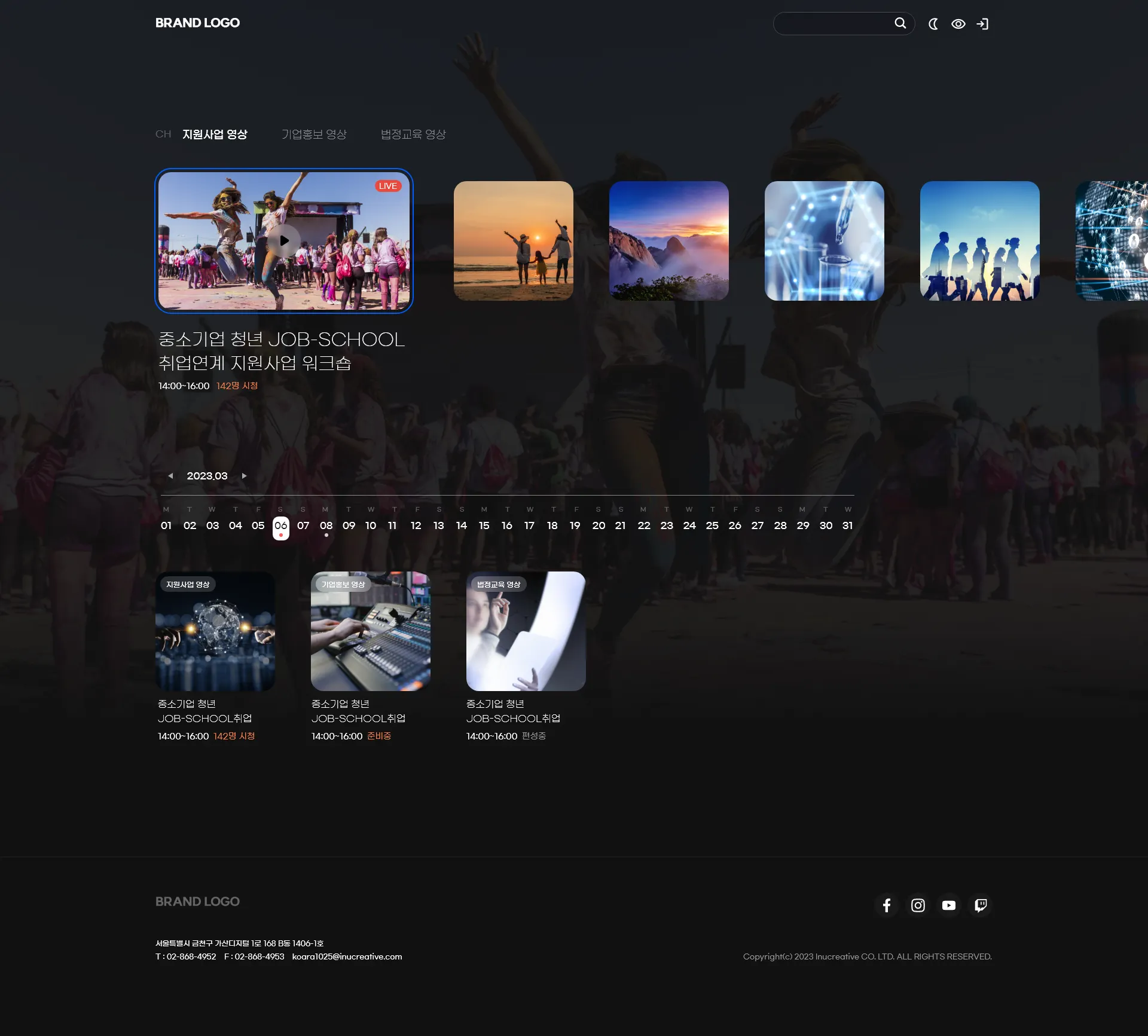 최근 등록된 콘텐츠 or 라이브 스케줄을 슬라이드 메인배너 형태로 중앙에 표시해주고 채널에 편성된 스케줄을 한눈에 확인할 수 있는 캘린더 형태의 뷰를 제공합니다. 사용자 기호에 따라 배경 설정을 Dark, White 모드 서로 조정할 수 있으며 저시각자를 위한 그레이스케일 기능을 기본 제공합니다.