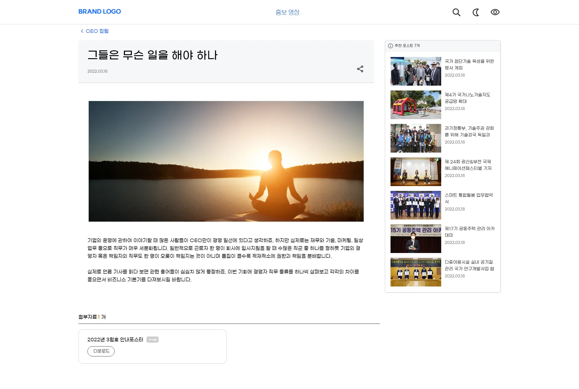 포스트 콘텐츠는 블로그처럼 이미지와 텍스트 형태를 조합하여 만드는 정적인 콘텐츠를 의미합니다. 이를 위해 관리자도구에서 제공하는 에디터를 통해 폰트사이즈와 컬러, 배열, 이미지사이즈, 위치 등을 자유롭게 편집할 수 있습니다. 우측 영역에는 연관된 추천 콘텐츠가 보여지도록 구성되었습니다.