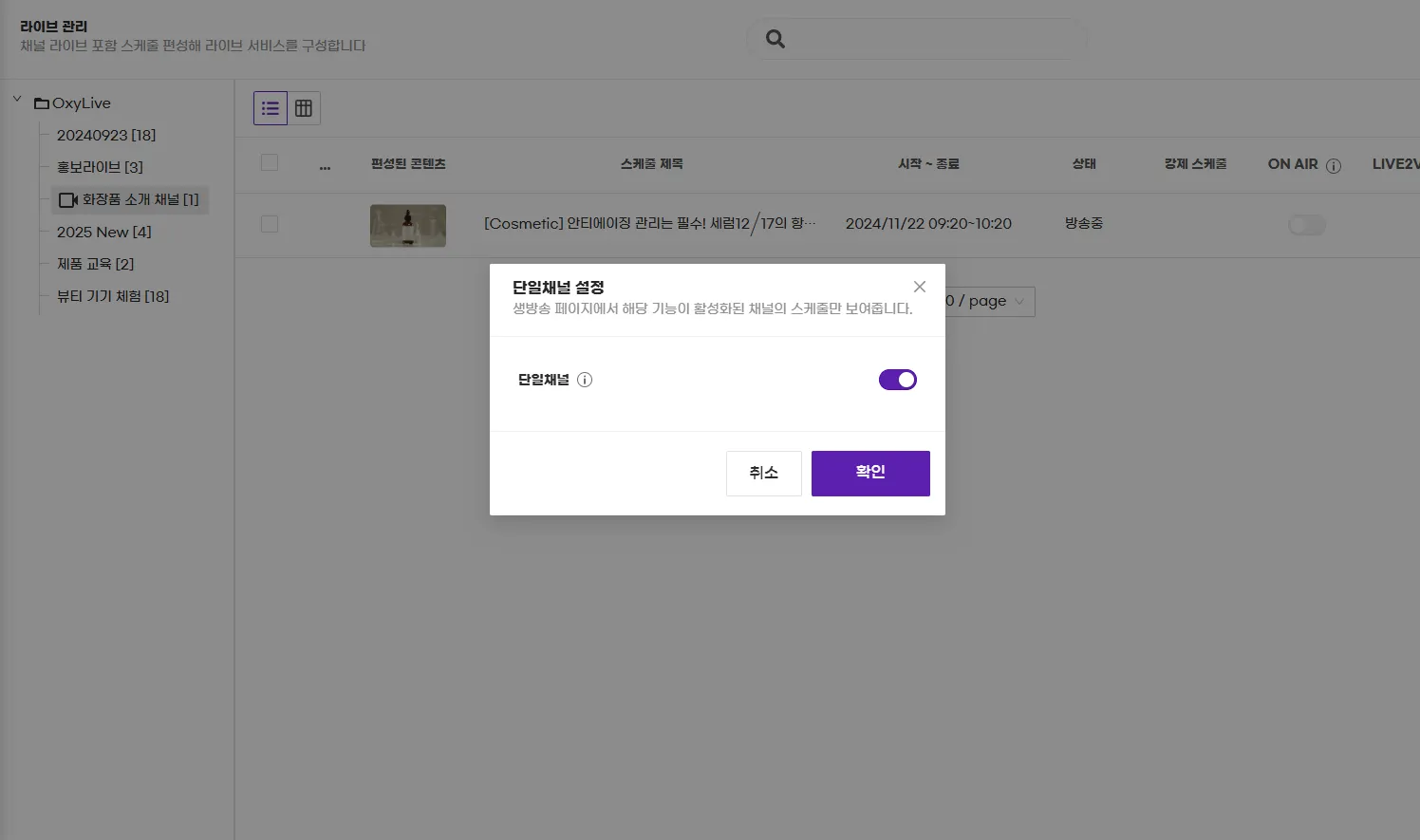 라이브메뉴 하위에 구성된 다수의 채널중 원하는 채널명 우측 설정에서 ... > 단일채널 설정 을 클릭하면 설정 팝업이 띄워지고 토글 버튼을 활성화하고 확인버튼을 클릭합니다.