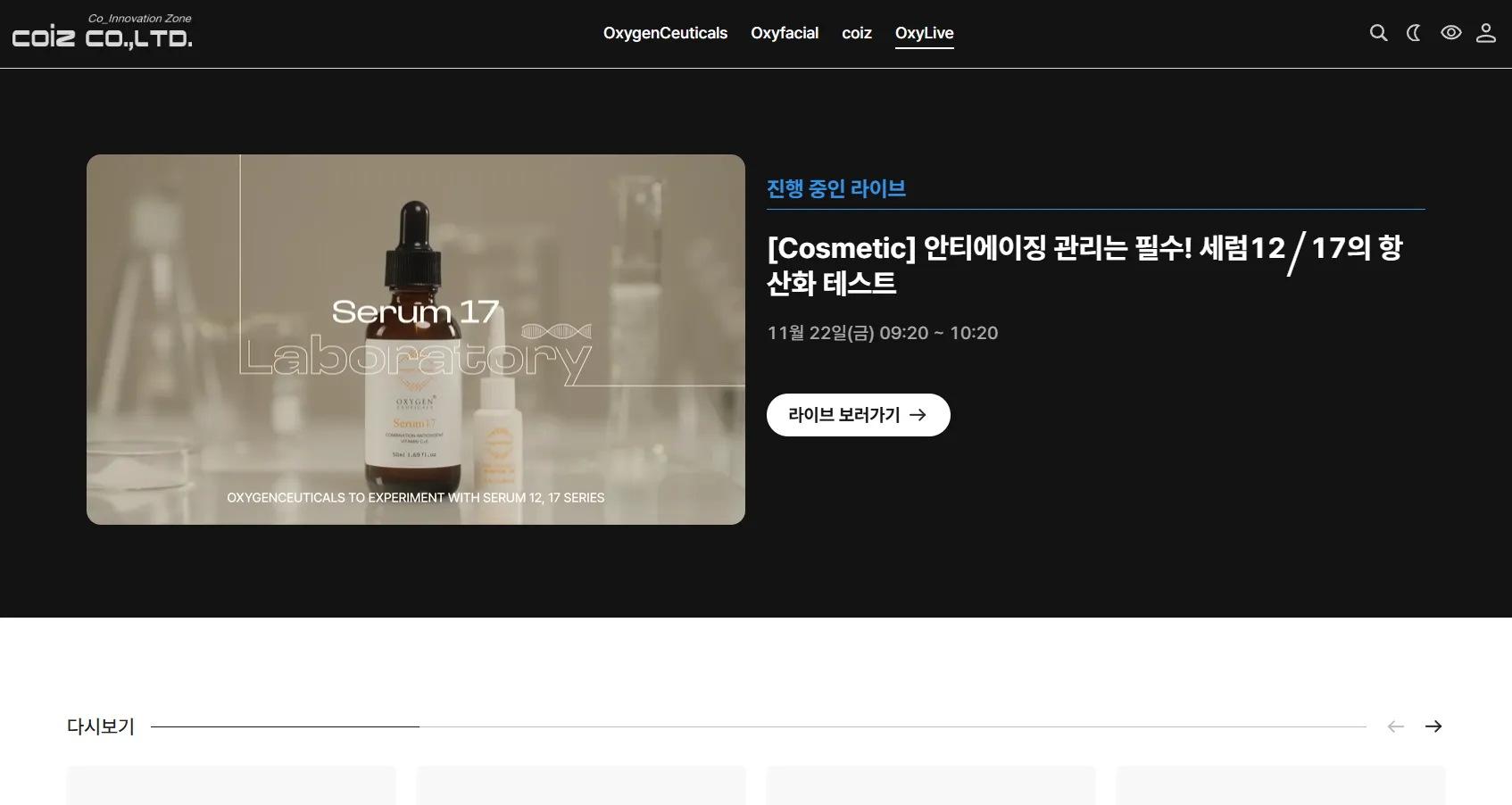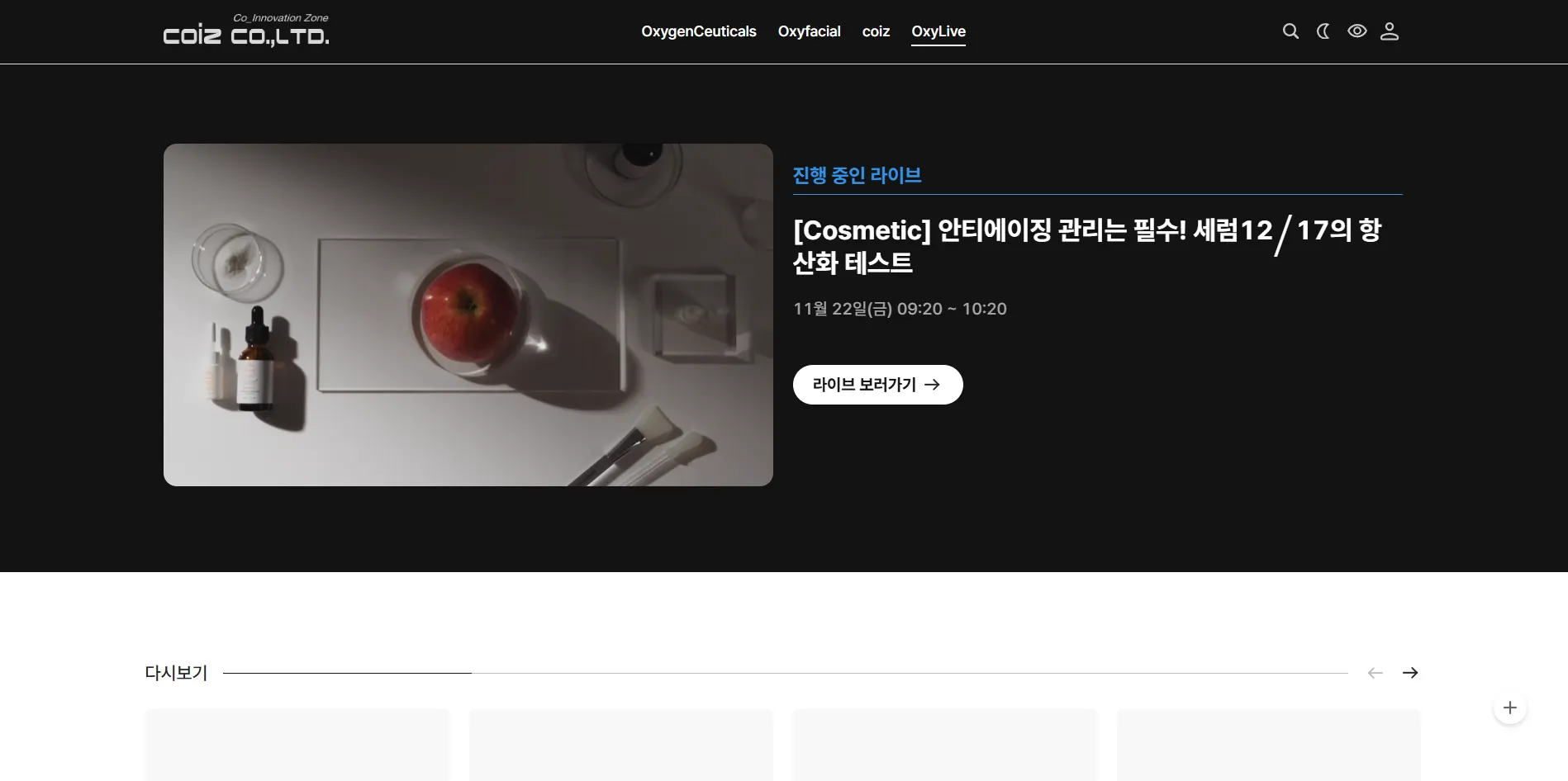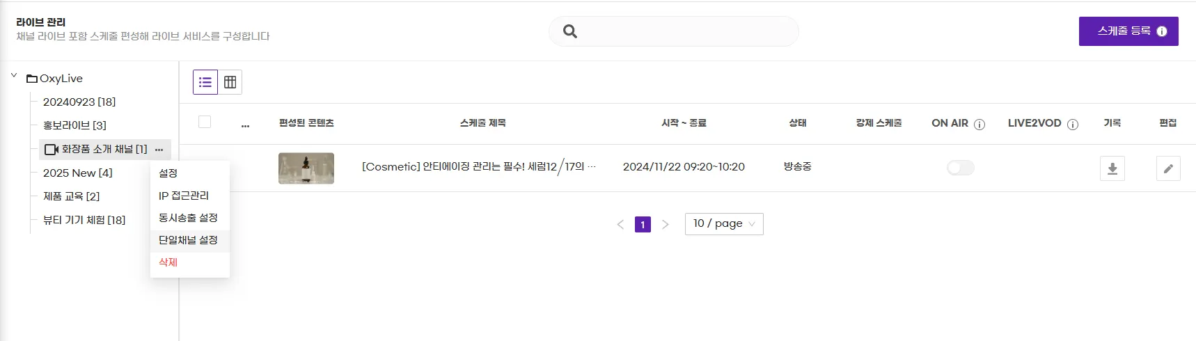 위 화면은 OxyLive 라고 라이브메뉴명을 설정하였고 [단일채널]을 설정하여 해당라이브 방송중, 준비중 등 정보가 표시되고 있다