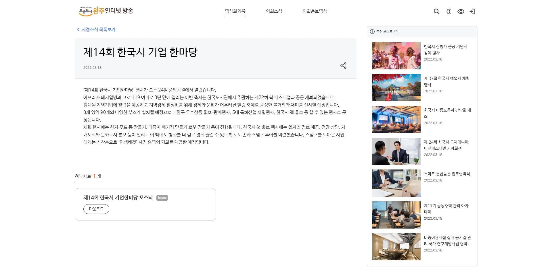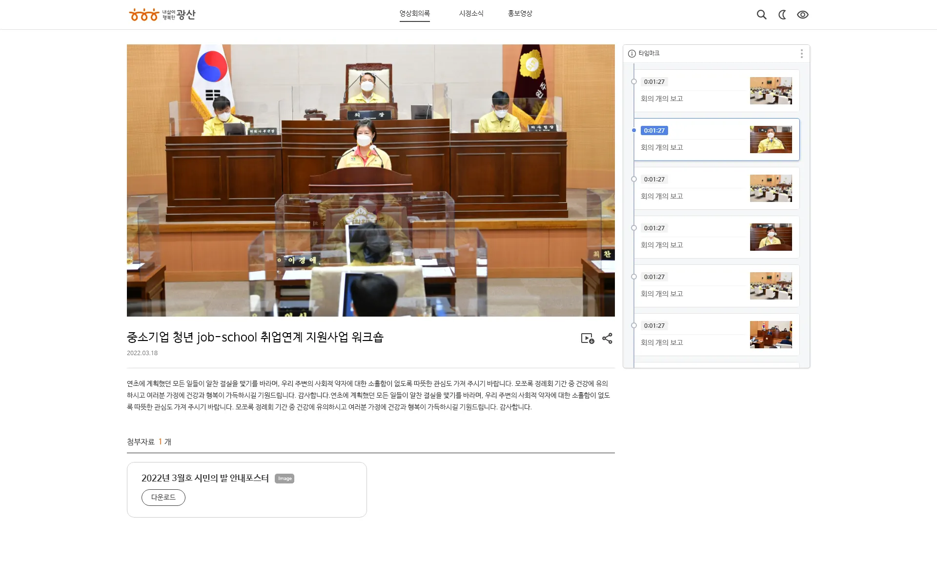 다른 상세페이지와는 다르게 영상 화면 아래에서 관리자가 등록한 회의록이 보이며 회의록 펼침/닫힘 기능을 제공