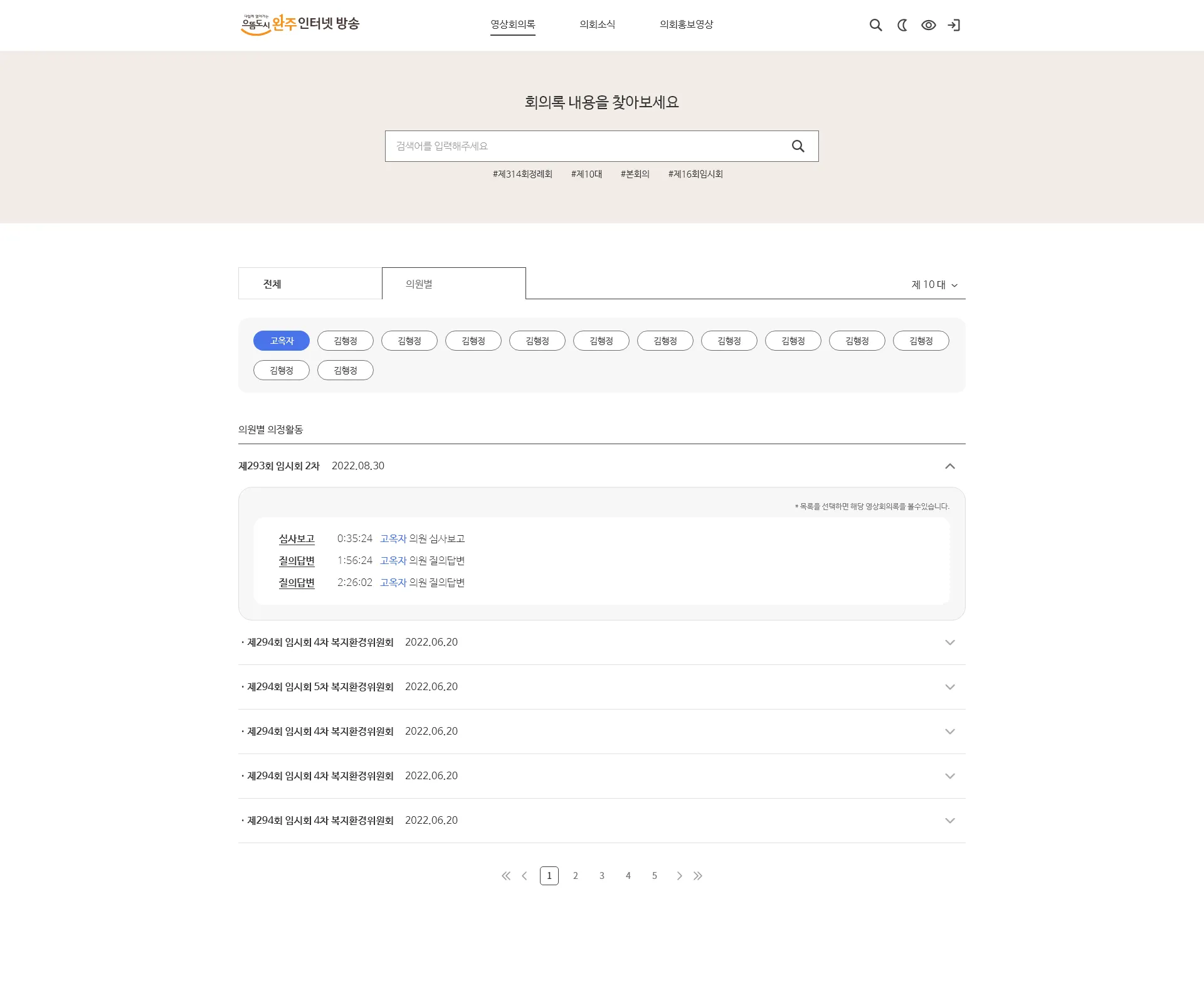 영상회의록 템플릿에서는 다른 템플릿과 다르게 영상회의록 페이지를 사용할 수 있습니다. 해당 페이지에서는 회의록 검색 기능을 제공하고 의원별 검색과 대수별로 필터 기능을 지원합니다.