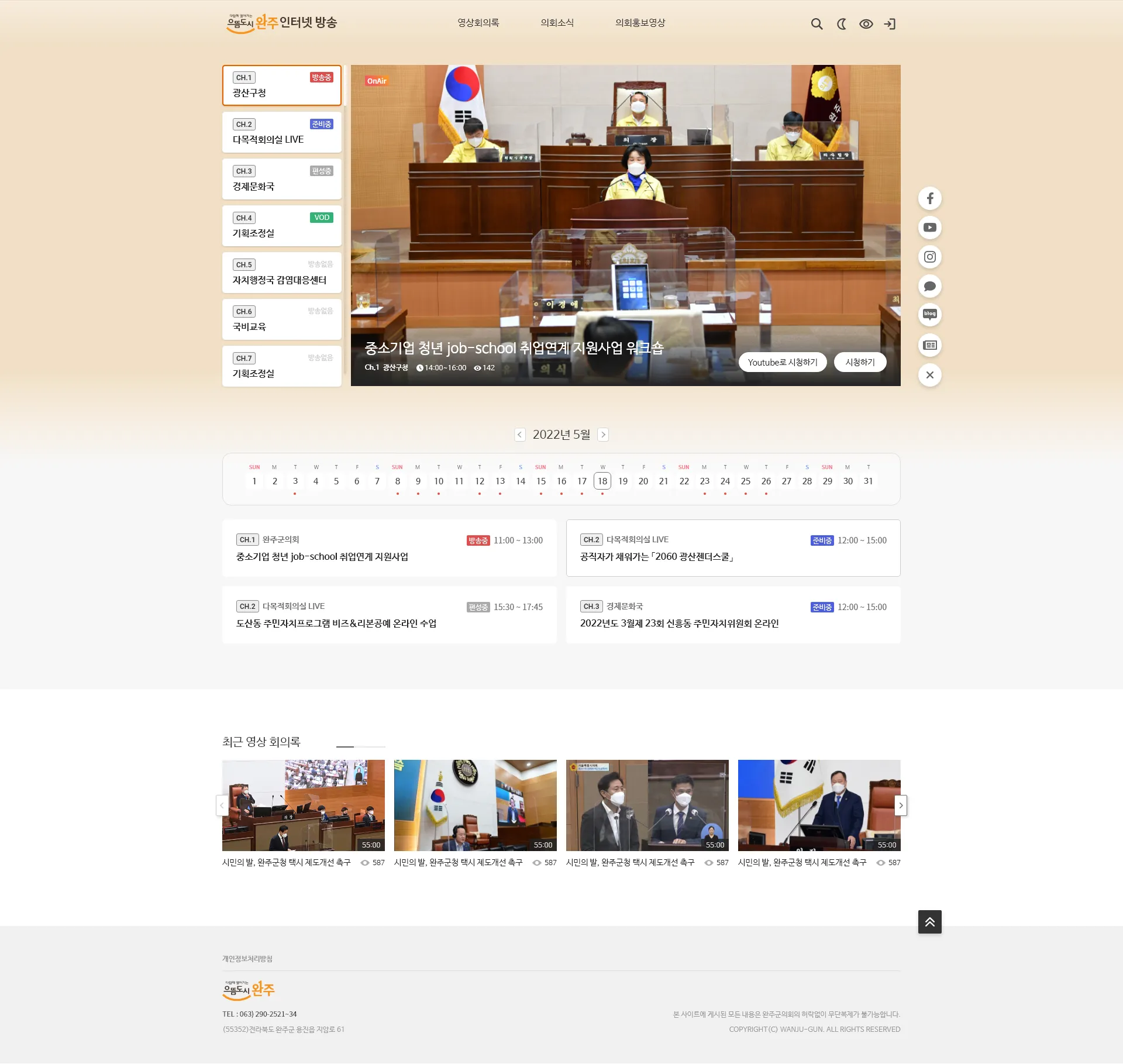 관리자가 생성한 채널에서 실시간으로 송출중인 라이브 방송을 표시해주고 채널에 편성된 스케줄을 한 눈에 확인할 수 있는 캘린더 형태의 뷰를 제공합니다. 최근 등록된 영상회의록 비디오 콘텐츠를 하단에 제공합니다. GMA는 Gov Meet Archive의 약자로, 주로 지자체 또는 정부 등에서 활용되는 템플릿입니다.