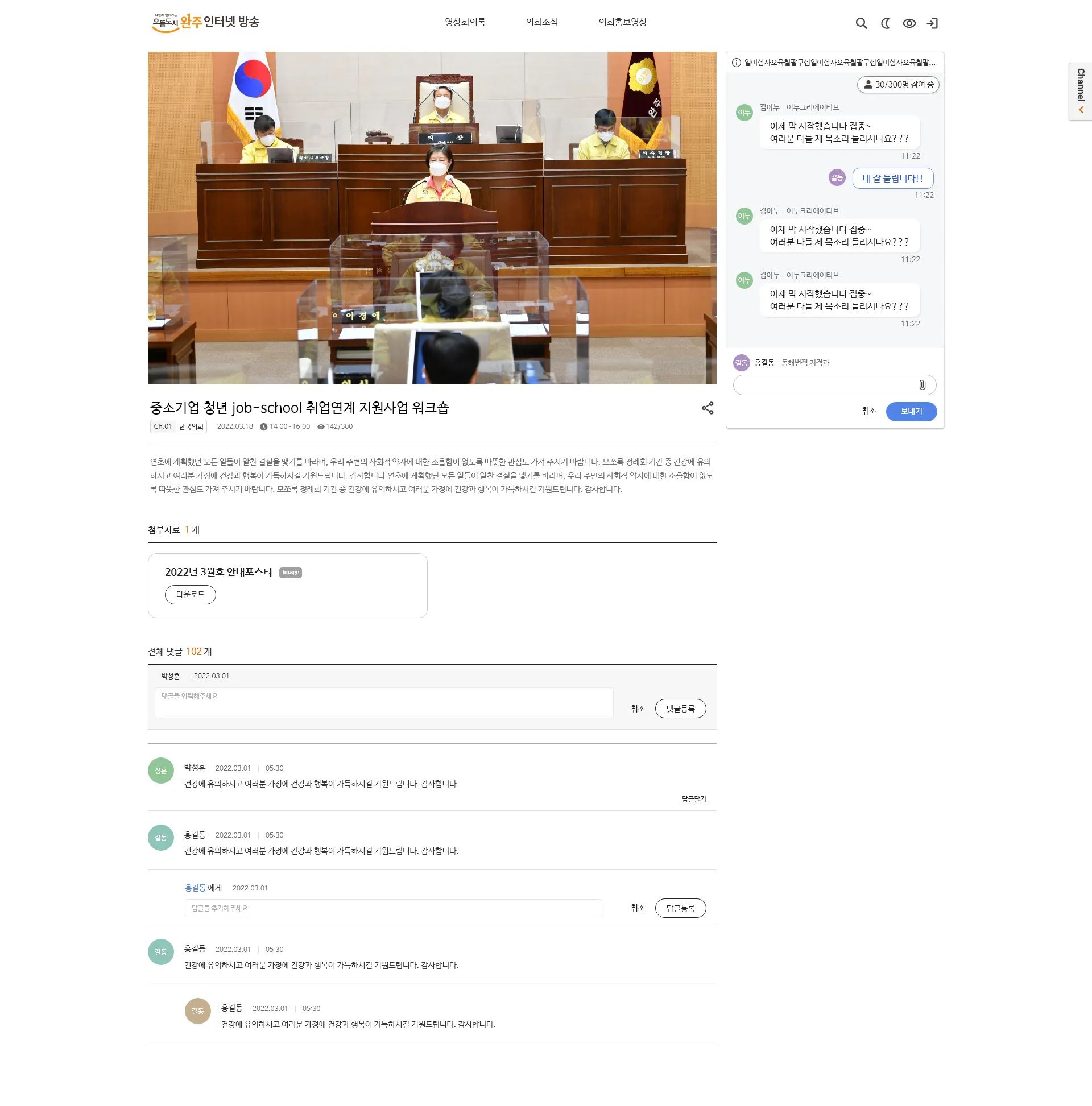 영상회의록 템플릿 중 채널에서 실시간으로 방송을 송출 중인 메인 화면