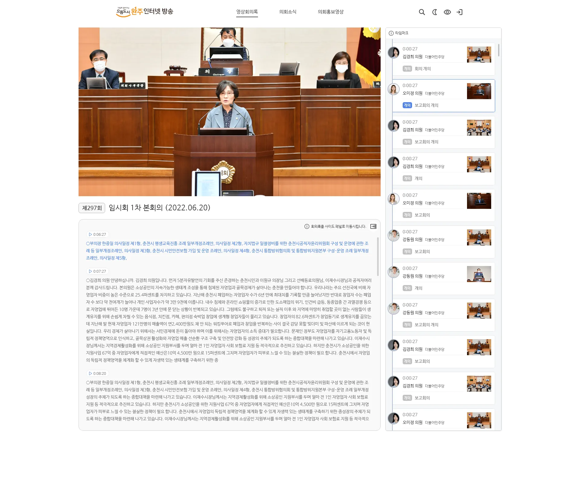 타임스탬프에서 발언자와 소속 등의 의원 정보를 보여줍니다.