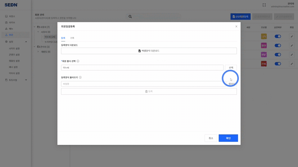 항목에 정보가 입력되지 않은 경우 회원 등록이 되지 않습니다. 일괄 등록 창에 있는 업로드를 클릭해 입력한 엑셀 양식을 업로드 하고 등록을 클릭합니다.
