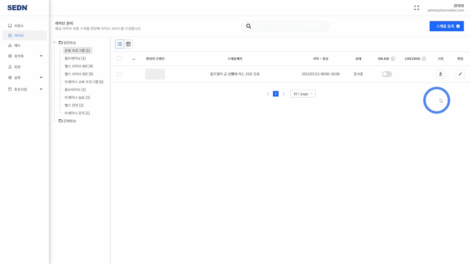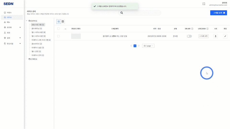 라이브 메뉴의 스케줄 정보 입력 창에서 LIVE2VOD 기능을 ON한 후 저장하면 해당 기능을 활성화할 수 있습니다. 이때 어느 저장소폴더에 등록할지 설정도 같이합니다.