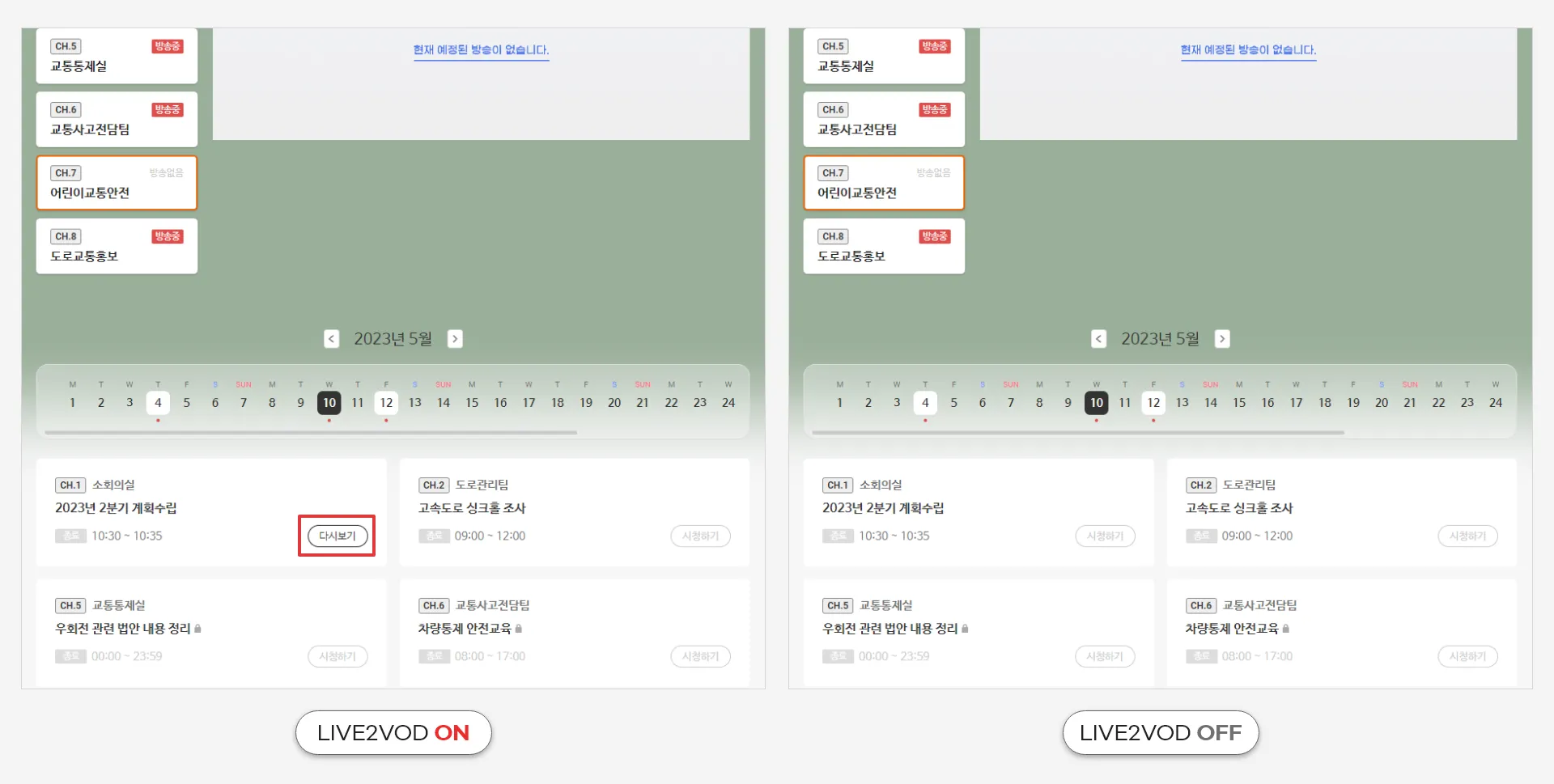 라이브와 동시에 서버에 영상파일을 저장하고 라이브 종료와함께 바로 다시보기(VOD)를 제공합니다